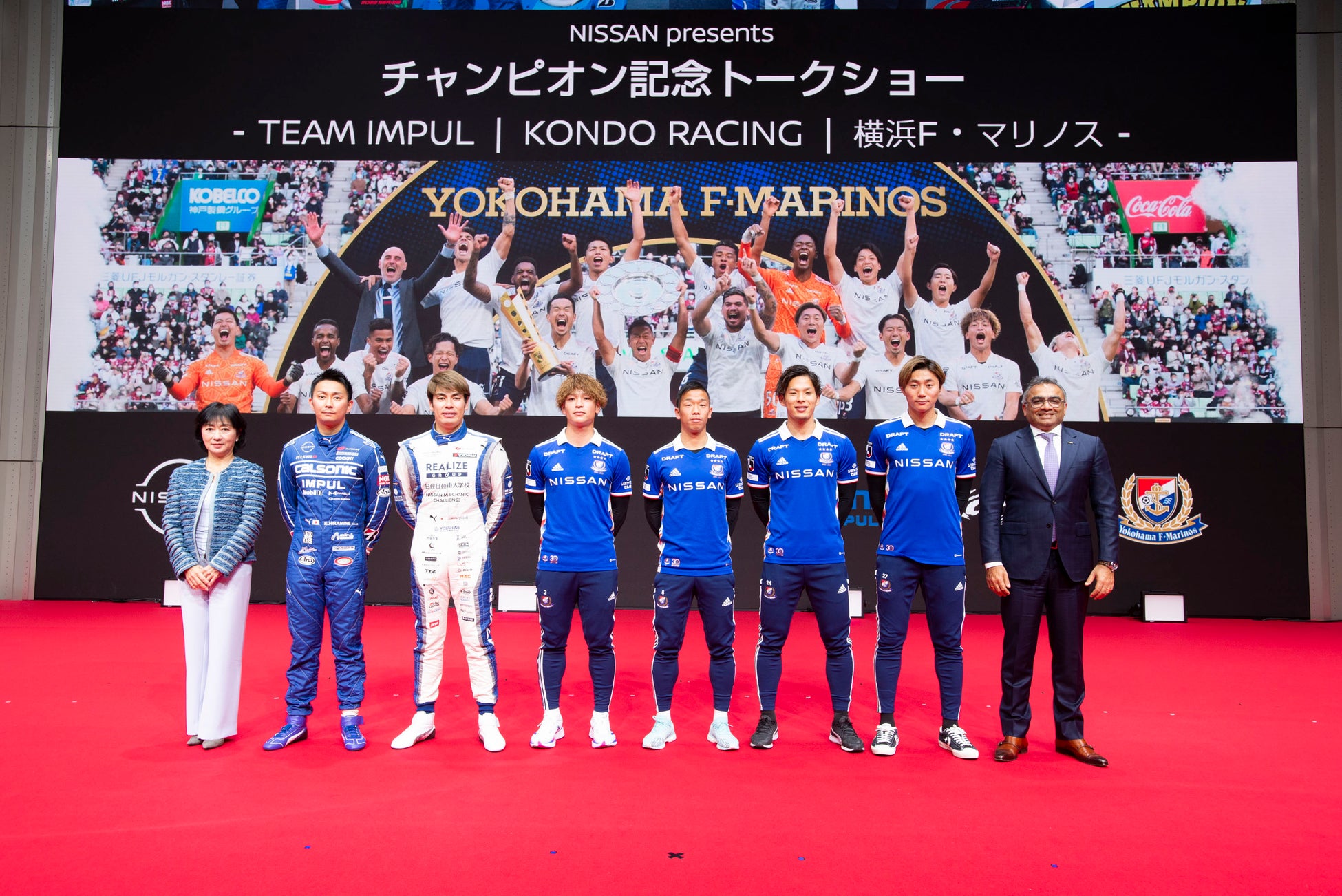 日産自動車株式会社(以下:日産自動車、本社:神奈川県横浜市西区 社長:内田 誠)は、トップパートナーを務めるプロサッカークラブ横浜F・マリノス(運営法人:横浜マリノス株式会社、本社:神奈川県横浜市港北区 社長:中山 昭宏)の2022 明治安田生命J1リーグ優勝と、国内最高峰のツーリングカーレース「SUPER GTシリーズ」のGT500クラスとGT300クラスで、日産自動車と日産モータースポーツ&カスタマイズ株式会社(本社:神奈川県茅ヶ崎市、社長:片桐 隆夫、略称NMC)が共に支援する「TEAM IMPUL」、「KONDO RACING」による両クラスシリーズチャンピオン獲得を記念して、2022年12月20日(火)に「NISSAN presents チャンピオン記念トークショー -TEAM IMPUL | KONDO RACING | 横浜F・マリノス- 」を開催しました。