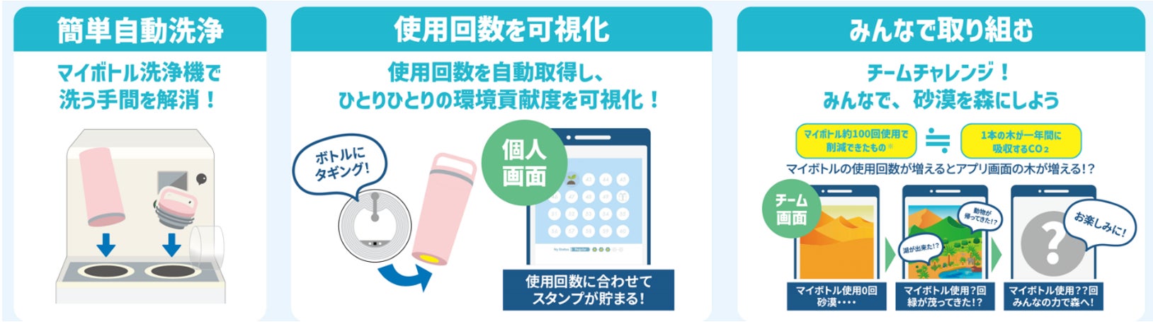 マイボトルの継続的な利用を促進し、プラスチックカップやペットボトル利用削減によるCO2排出量の削減を実現するプログラムです。こうした、プラスチックに関する社会課題解決に向けて構築した「プログラム」は、サトーの強みである自動認識技術(RFID※ など)に、新たに独自開発したCO2の削減量などを可視化するアプリや、象印がマイボトル利用の課題解決に向けて新たに開発したマイボトル洗浄機などを用い、オフィスでのマイボトルの利用を推進し、社員の行動変容を促します。