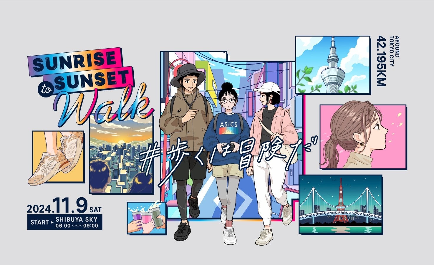 株式会社アールビーズ(東京都渋谷区、代表取締役社長:黒崎悠)は、アシックス商事株式会社(兵庫県神戸市、代表取締役社長:小林淳二)、日本テレビ放送網株式会社(東京都港区、代表取締役社長執行役員:石澤顕)と三社共同主催で東京都内を42.195km歩いて巡る新たなウォーキングイベント「Sunrise to Sunset Walk」を2024年11月9日(土)に開催いたします。