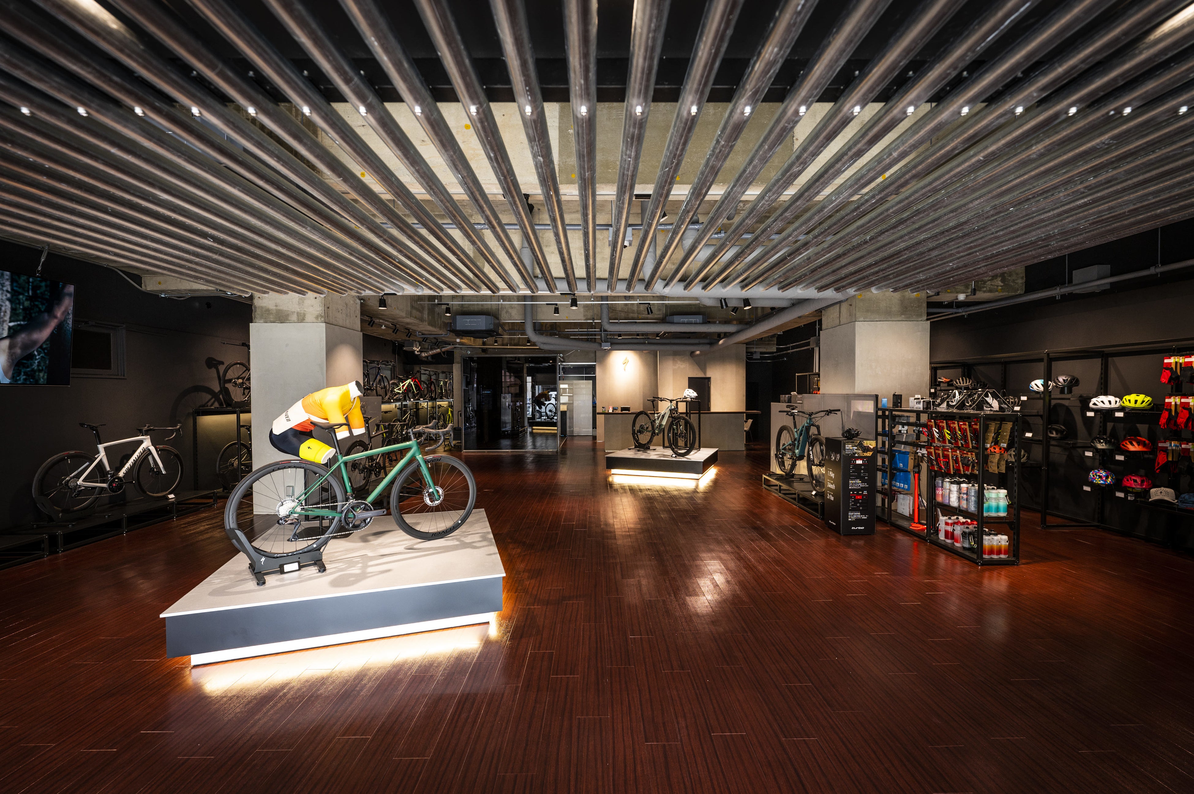 日本三大名城「熊本城」の城下町でもある細工町で、アメリカブランドであるスペシャライズドと和が融合した店舗がコンセプト。厳選されたコナコーヒーの独特の香り、映像や音、試乗車など、五感でスペシャライズドを体験できるストアに仕上がっている。
