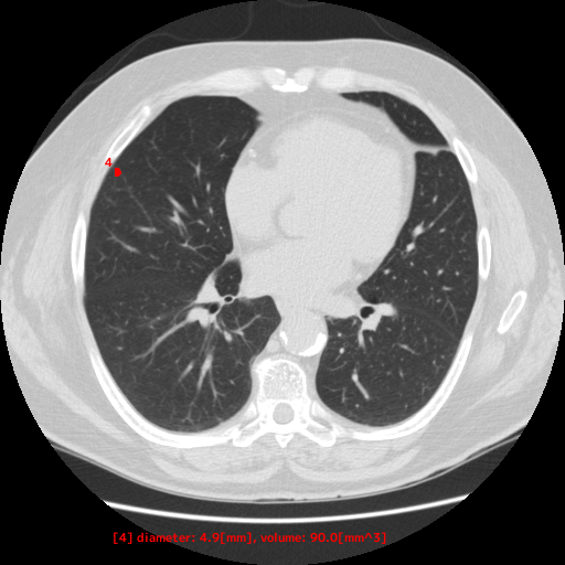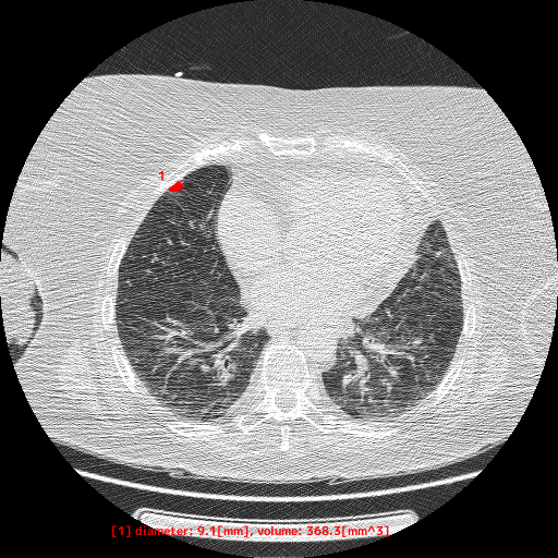 そこで、エルピクセルでは、胸部 CT 画像の肺野領域において肺結節候補域を観察対象の領域(関心領域)として抽出し、その体積と最大径を測定することで、医師の読影診断を支援するソフトウェアの開発に取り組みました。