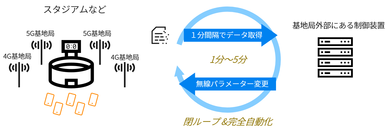 ソフトバンクとエリクソン・ジャパンは、こうした課題を解決するために、基地局外部にある制御装置でネットワークのパフォーマンスのデータを1分間隔で取得し、トラフィックの変動を認識できる仕組みを実装するとともに、取得したデータを基に複数の周波数・基地局を含めてパフォーマンス改善のための最適化策を自動的に判断し、該当の基地局に対して無線パラメーターの自動制御を行う高速自動最適化機能を構築しました。