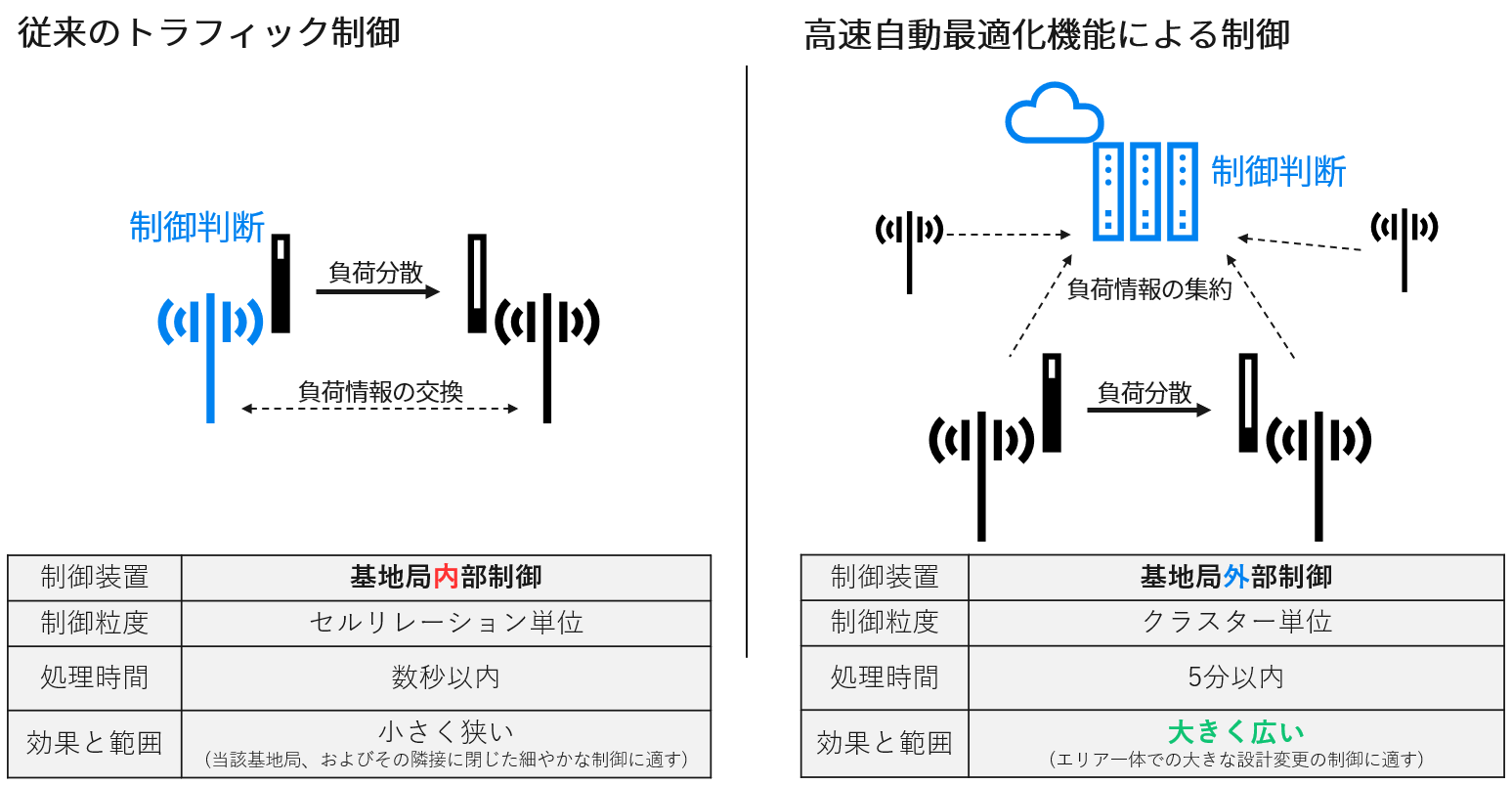 無線装置に具備された従来の基地局内部制御では、基地局のカバレッジエリアとその隣接部を考慮したより高速な最適化の処理が可能である一方、トラフィック制御の対象範囲が限定的なものでした。これに対し、高速自動最適化機能では、クラスター単位でのエリア一帯に対して、外部装置が俯瞰した判断を高速に行うことで、より大きな変動を伴うトラフィック制御が可能です。そのため、イベント開催時のような短時間での急激なトラフィック変動を伴う制御において大きな効果を発揮します。