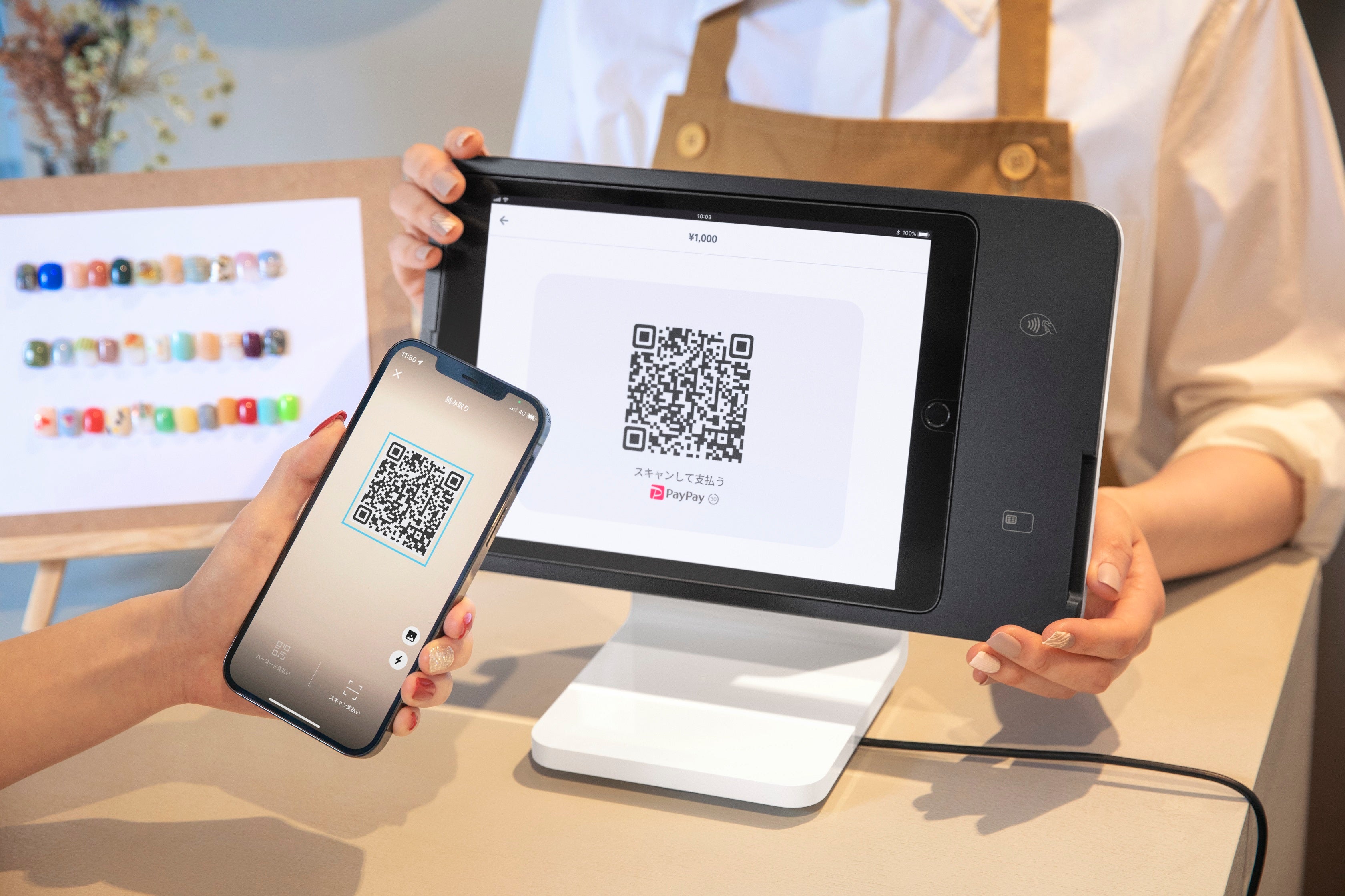 今回Squareが採用したPayPayの支払い受付方法は、「ユーザースキャン方式(動的店舗提示型QRコード)」です。この方式は、お客さまが事業者の画面に表示されるQRコードをPayPayを使って読み取ると金額が自動で入力されるため、お客さまは自分で金額を入力する必要がありません。これにより、売り手と買い手の双方にとって、より簡単で迅速な決済を実現し、正確な取引を可能にします。事業者は、QRコードを決済端末の画面もしくはスマホやタブレットなどのモバイル機器の画面で表示するため、会計テーブルに決済端末以外を置くスペースを用意する必要はありません。またQRコードは、決済ごとに生成されるため、セキュリティ強化にも繋がります。