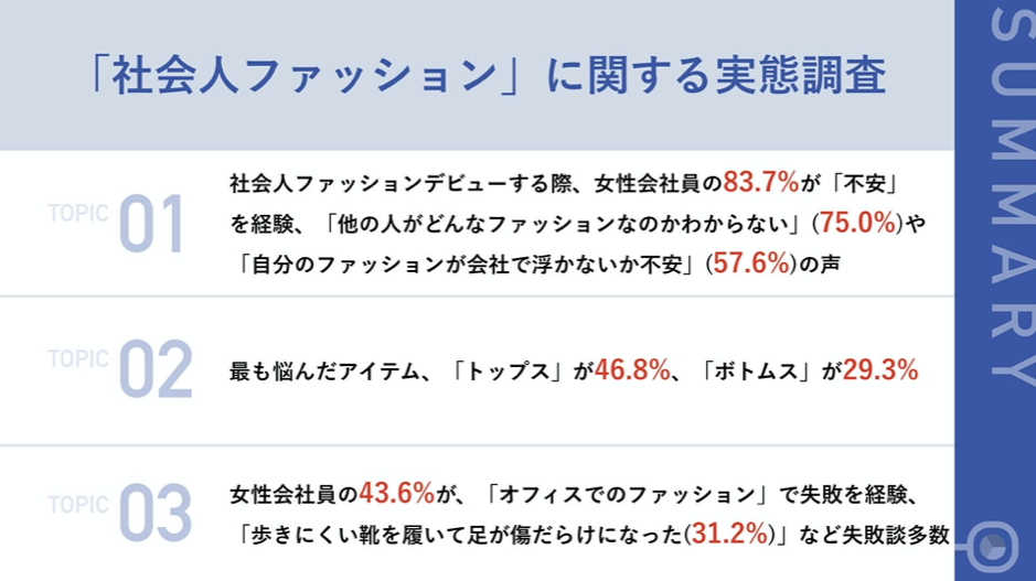 - 社会人ファッションデビューする際、女性会社員の83.7%が「不安があった」と回答