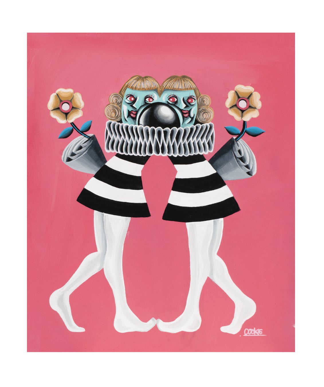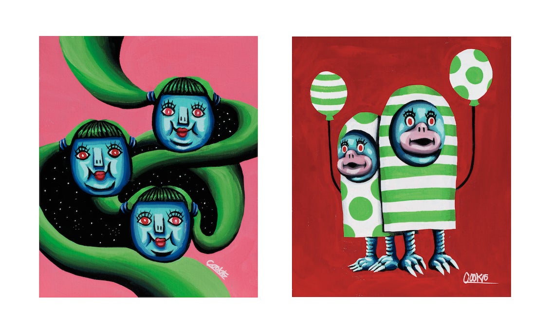 In 2019, his career as a painter started under the name of "COOKIE" at KOMIYAMA TOKYO. The strange characters depicted in the "Future Human" series, which is based on the fictional humans in the near future, have established a one-of-a-kind style as the "new language" of his artistic career. Aside from the work, COOKIE pursues his passion for comedy, rock-band activities, motorcycle collection, and mods fashion, and always creates new and unique works.