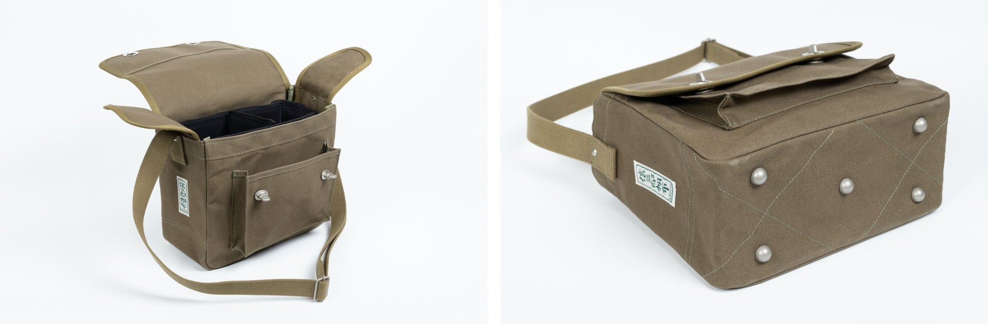 今回発売されるのはカメラバッグ。使い込むほどに豊かな表情が生まれる上質な綿帆布は、ライカのカメラとも相性のよい黒とオリーブカラーの2色をご用意しました。サイズ感やポケット、インナーのクッションをはじめ細部にいたるまでこだわりぬかれた本モデルならではの特別仕様です。また、正面から見て左側面には「信三郎帆布」、右側面には「LEICA STORE KYOTO」のネームが配されています。