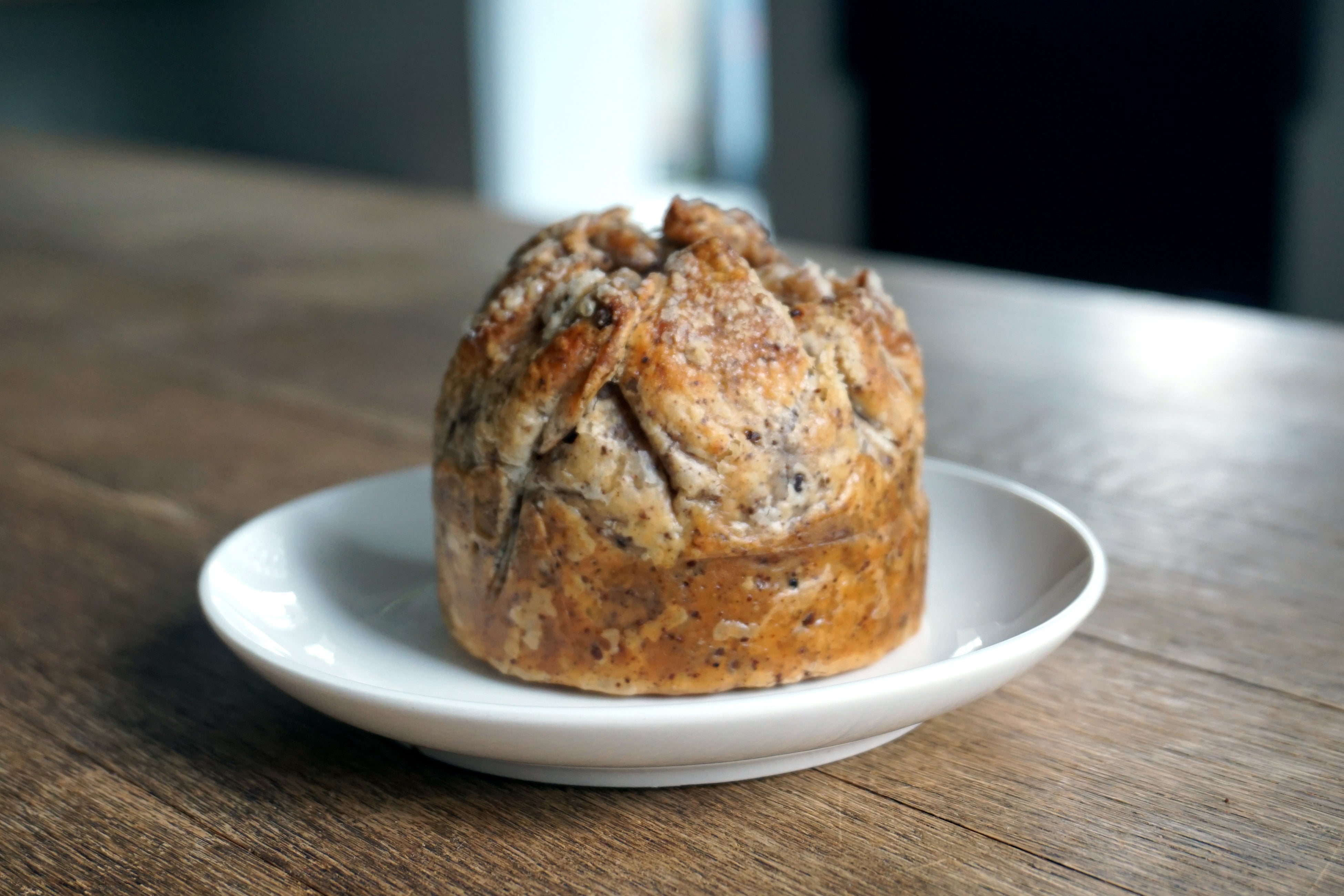 パイ生地には「SAVORY」のチョコレートを練り込み、さらにチップ状も混ぜ合わせているので、チョコレートの大きさによる味わいや香りの変化をお楽しみいただけます。生地は職人が手折りでおつくりしていて、毎朝焼き立てをご用意します。開店直後にご来店いただくと焼き立てがご提供できるのでおすすめです。また生地の土台にはチョコレートのカスタードクリームとアーモンドクリームを使用した、クレーム・フランジパーヌを使用しています。