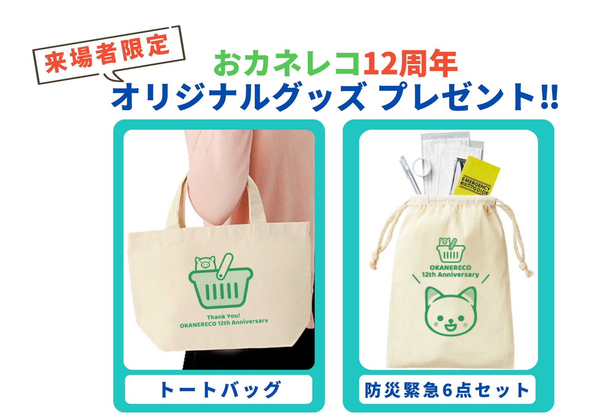 【来場者様への特典】おカネレコオリジナル「トートバッグ」「防災緊急6点セット」をプレゼント