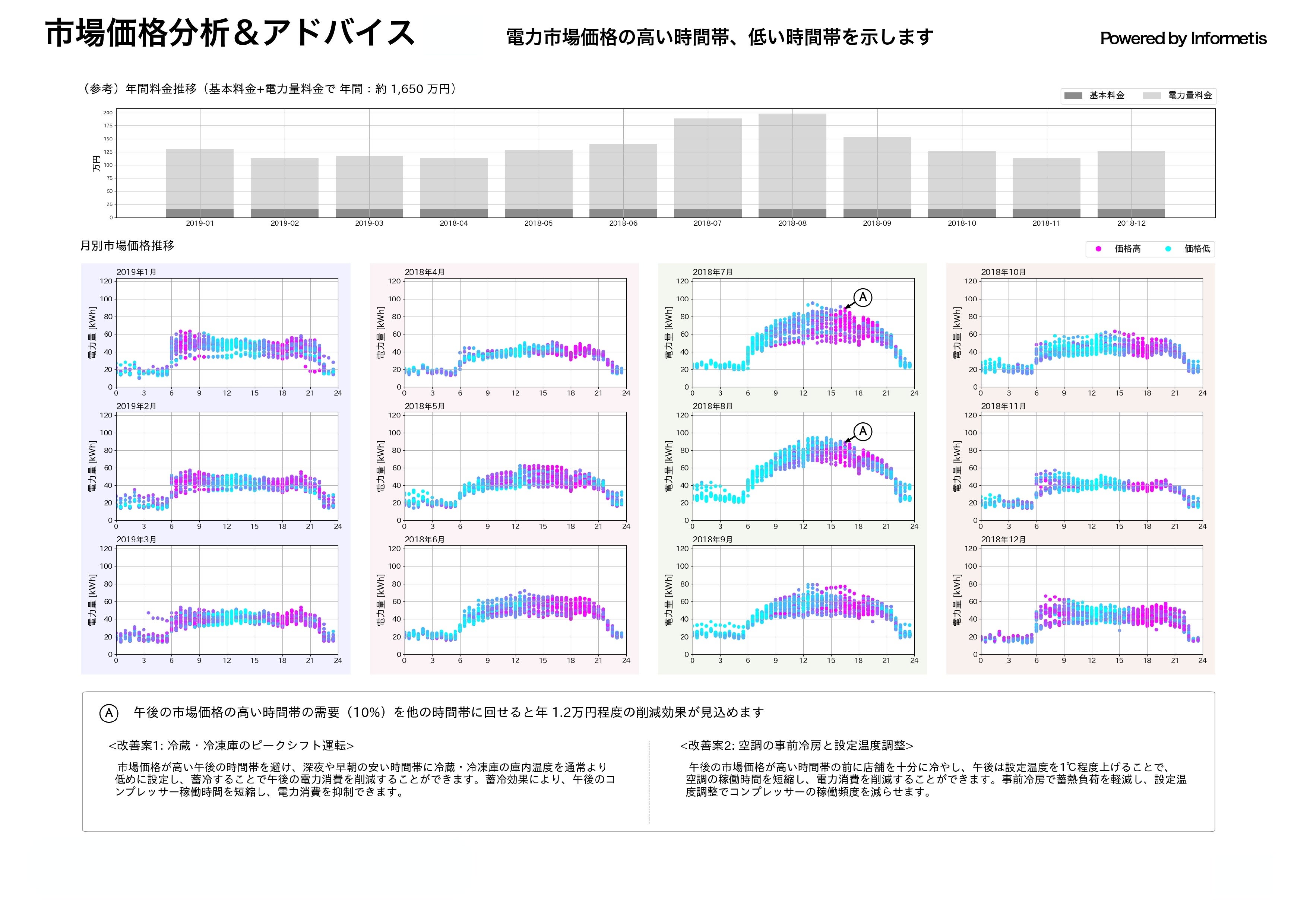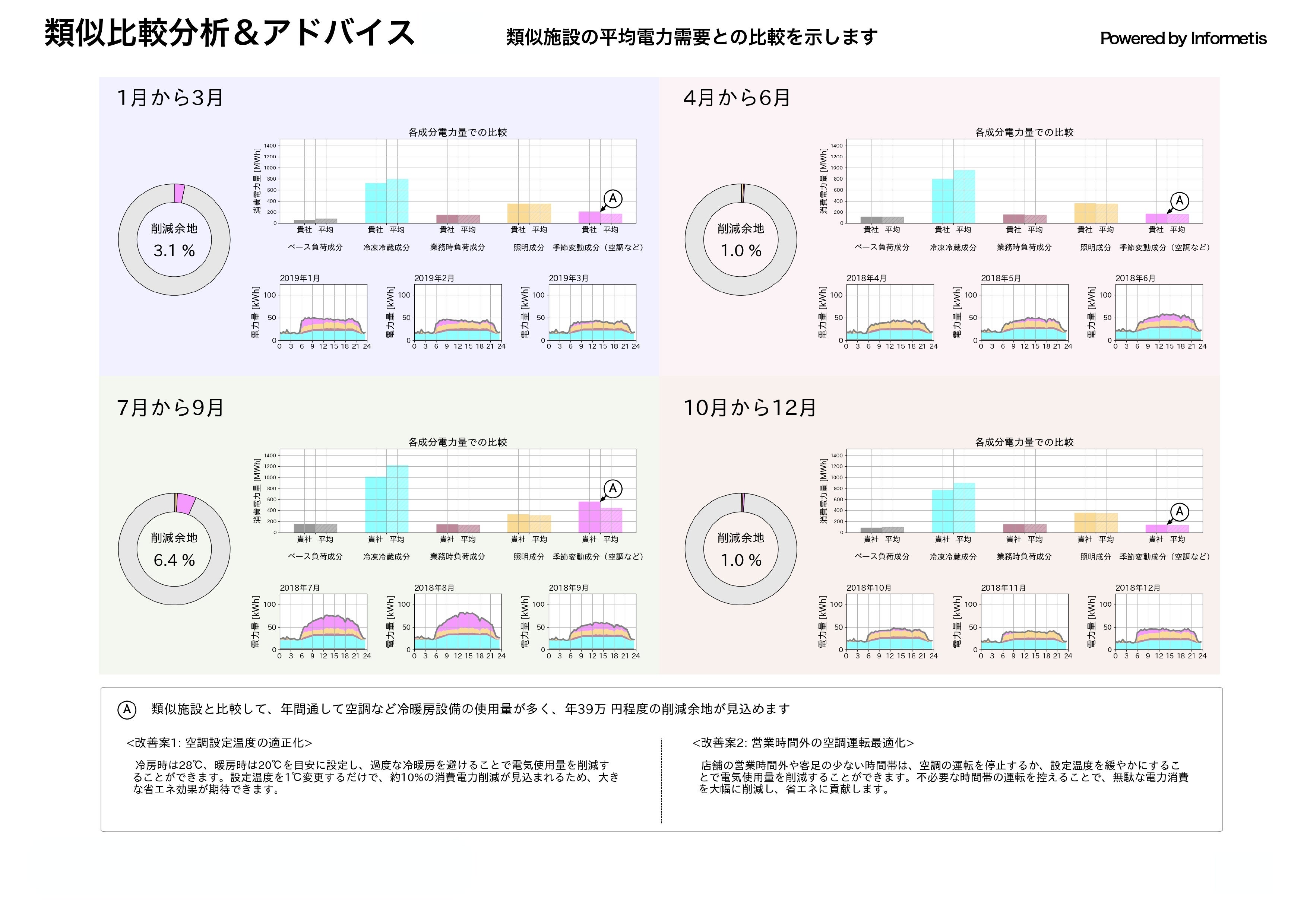 多くの小売電気事業者は法人電力需要家向けに電力使用量や電力料金の情報をデータとして掲載したマイページ等を提供していますが、その削減余地や削減方法は、法人電力需要家自身で検討を行うか、小売電気事業者の法人担当部門や節電コンサルタント事業者等による分析が必要で多大な労力やコストが必要でした。それに対して、インフォメティスの「エネマネ診断レポート」では、AIが各種分析による削減余地を直感的かつ定量的に提示し、その削減方法を具体的かつ分かり易くアドバイスするため、需要家自身が実際に削減行動を起こすハードルが大きく下がります。小売電気事業者にとっても、このような分析結果をマイページ等で提供することで、大きなコストをかけずに顧客へのよりよいサービス提供が可能となります。