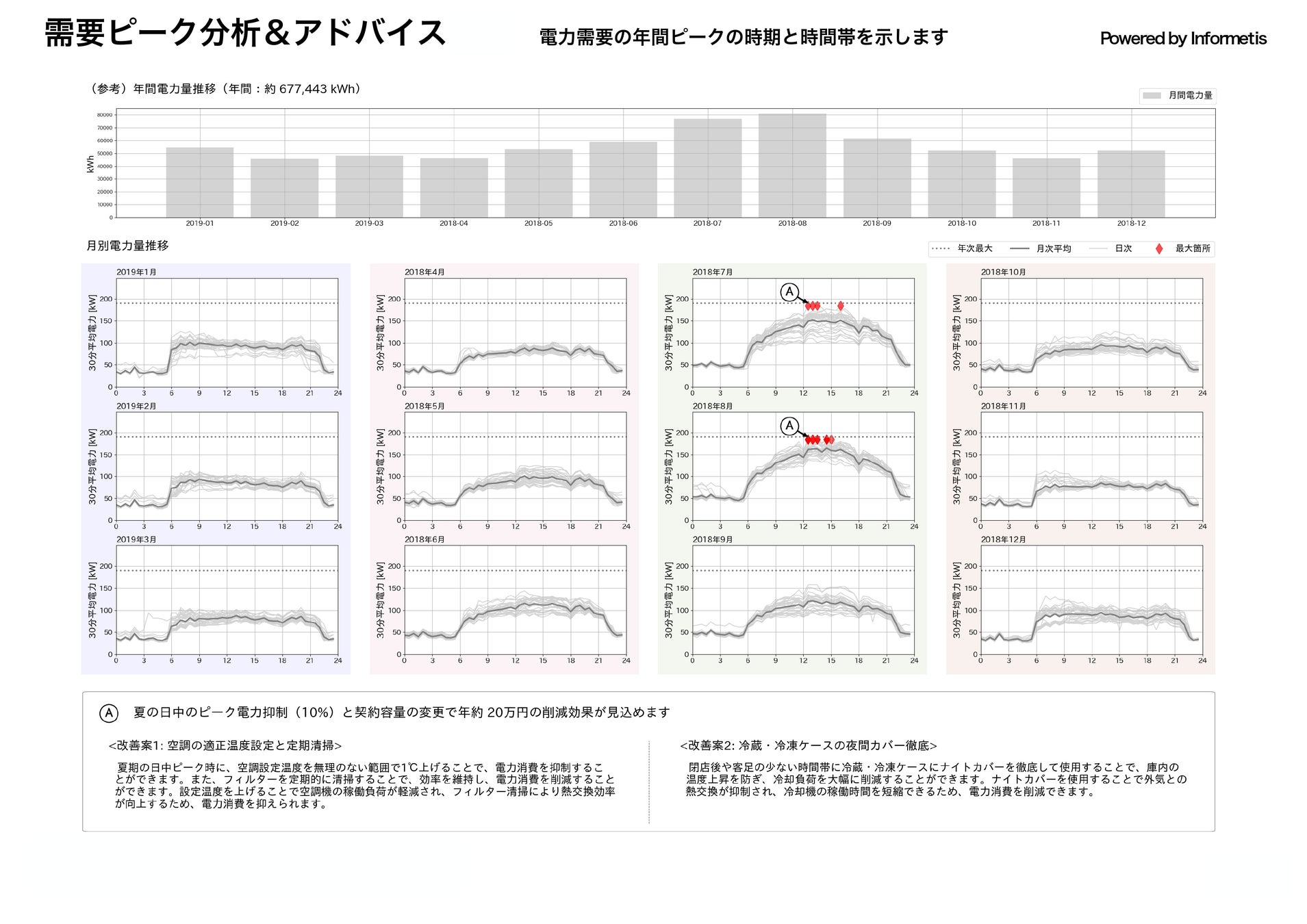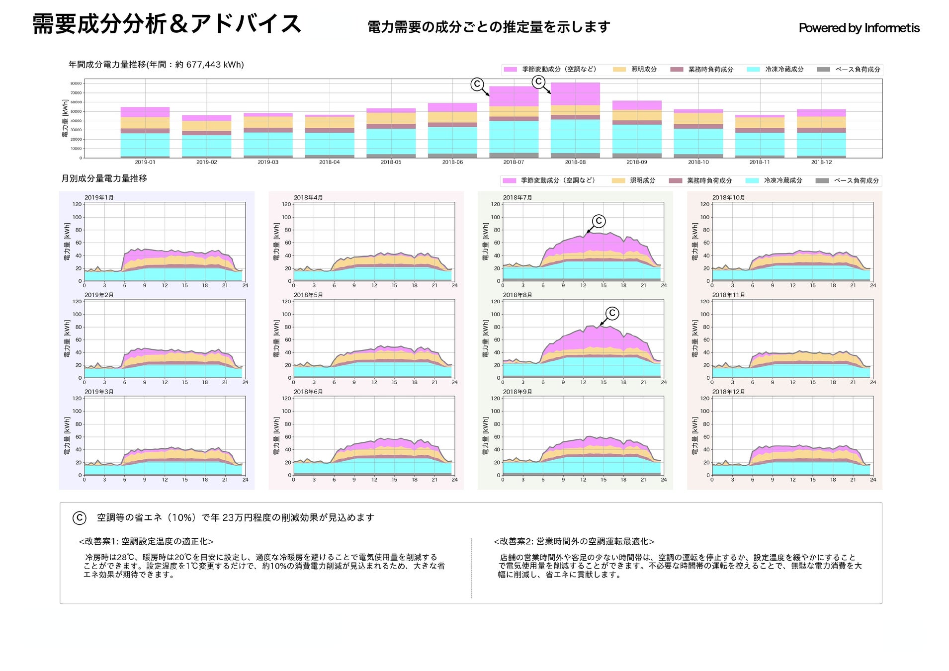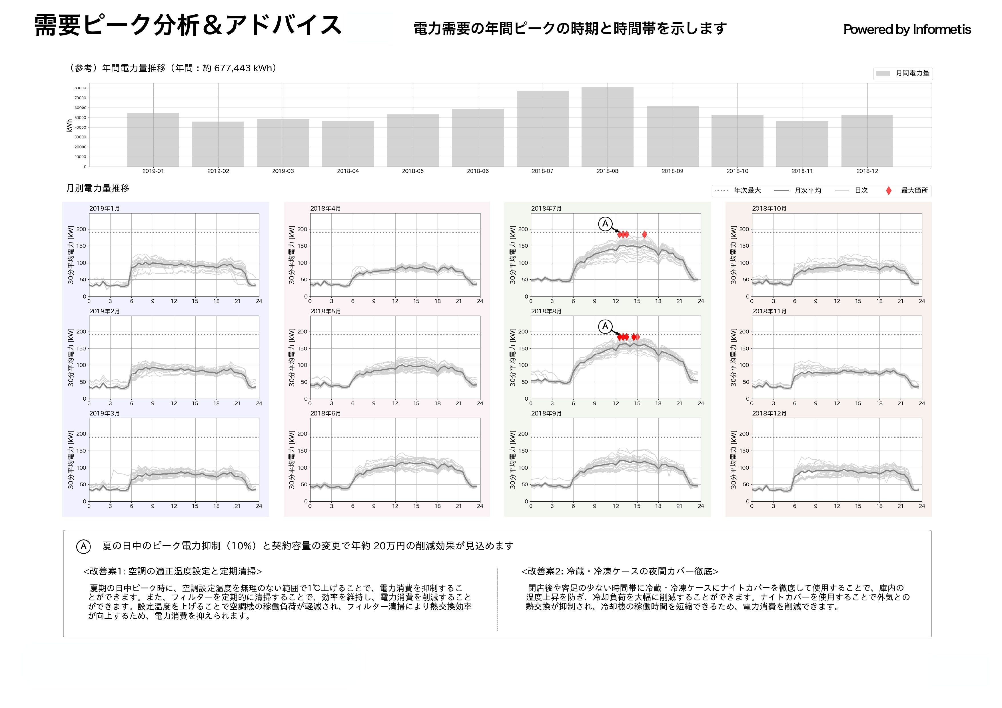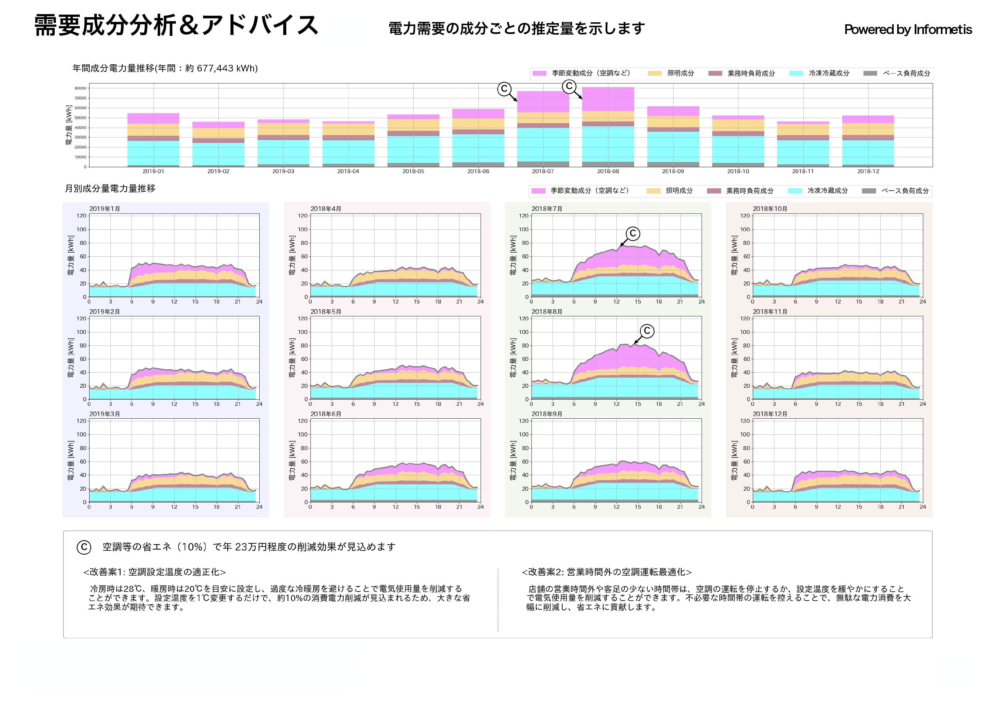 法人電力需要家向けの「エネマネ診断レポート」は、スマートメーターから取得した過去1年分の30分単位の電力使用量データ(以下、30分値データ)と需要家情報(業種、電気料金プランなど)から、当社の独自AIにより、需要ピーク分析、需要成分(照明・空調・冷蔵冷凍など)分析、類似比較分析、電力市場価格分析等の複数の分析を自動的に行い、その結果を直感的に理解できるように可視化するともに、各分析による定量的な数値をもとに電力削減余地を試算し、金額として推計することができます。さらに、対象施設の業種&業態に応じた削減方法に関する具体的なアドバイスを行うことができます。今後、伊藤忠エネクスとご契約のお客様を対象に、段階的にサービスが提供される予定です。