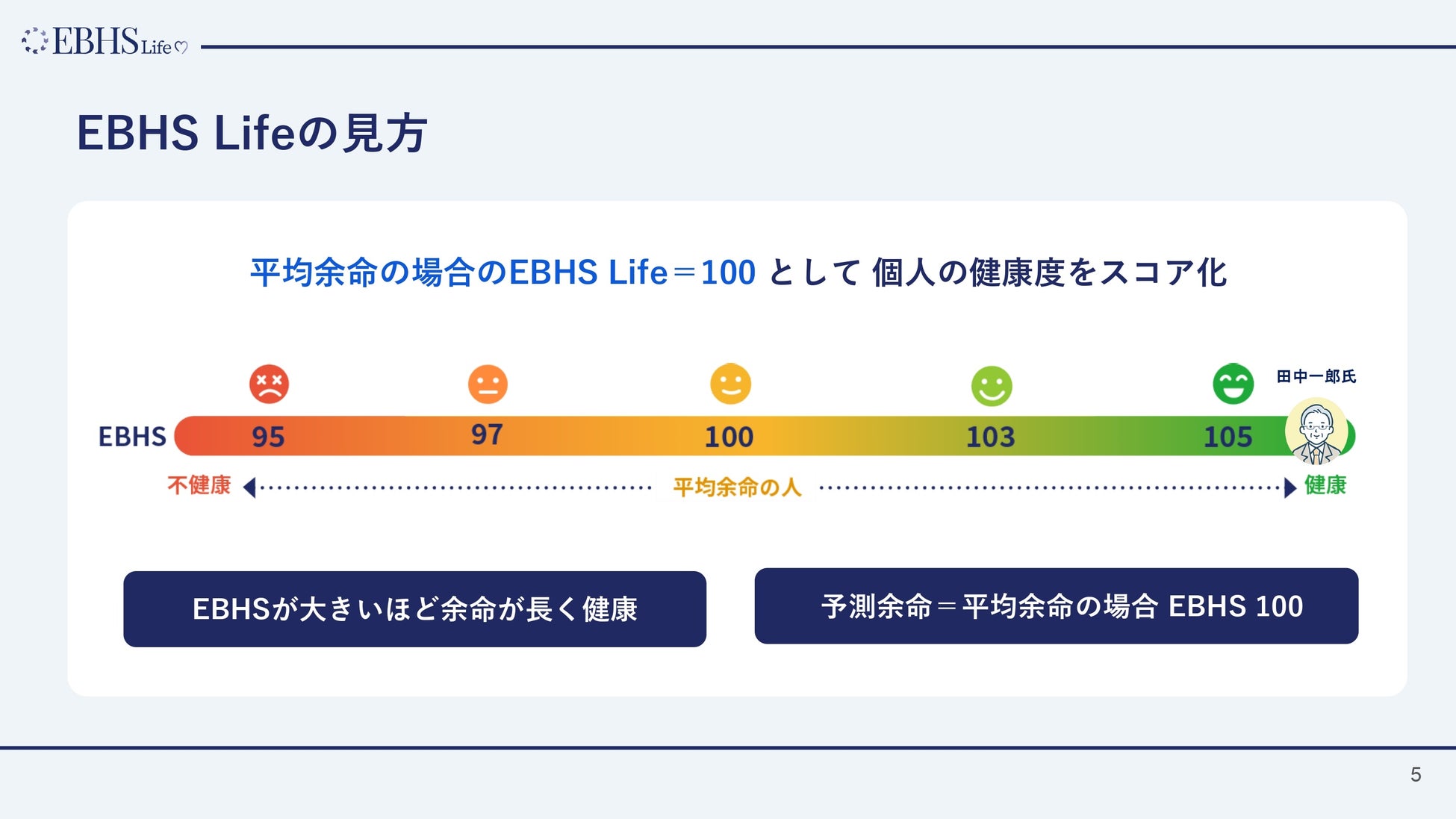 ブース内では、「EBHS Life(エビスライフ)」を体験いただけます。質問に答えるだけで、数万人分の健康関連データ、3,000件以上の論文レビューを基に、健診結果などから寿命を予測し、日本人平均との相対的な健康指標を算出。“自分が今どんな状態か”をメンタル・ボディ両面から総合的に評価することが可能です。