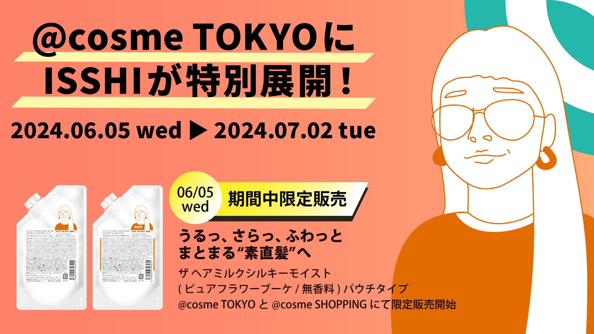 ISSHI(イッシ)が@cosme TOKYOで全商品を期間限定展開!@cosme TOKYO限定品や新商品を全国に先駆けて解禁。第一弾は人気の「ザ ヘアミルクシルキーモイスト」のパウチを限定販売!