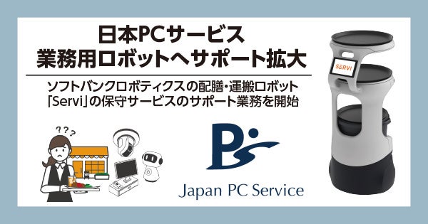 デジタル機器の総合サポート行う日本PCサービス株式会社(本社:大阪府吹田市、代表取締役社長:家喜 信行、証券コード:6025、以下「当社」)は、ソフトバンクロボティクス株式会社(本社:東京都港区、代表取締役社長 兼 CEO:冨澤 文秀、以下「ソフトバンクロボティクス」)の配膳・運搬ロボット「Servi」の、同社が行う保守サービスの一部サポート業務を受託し、2022年3月1日(水)より業務用ロボットのサポートを本格開始します。