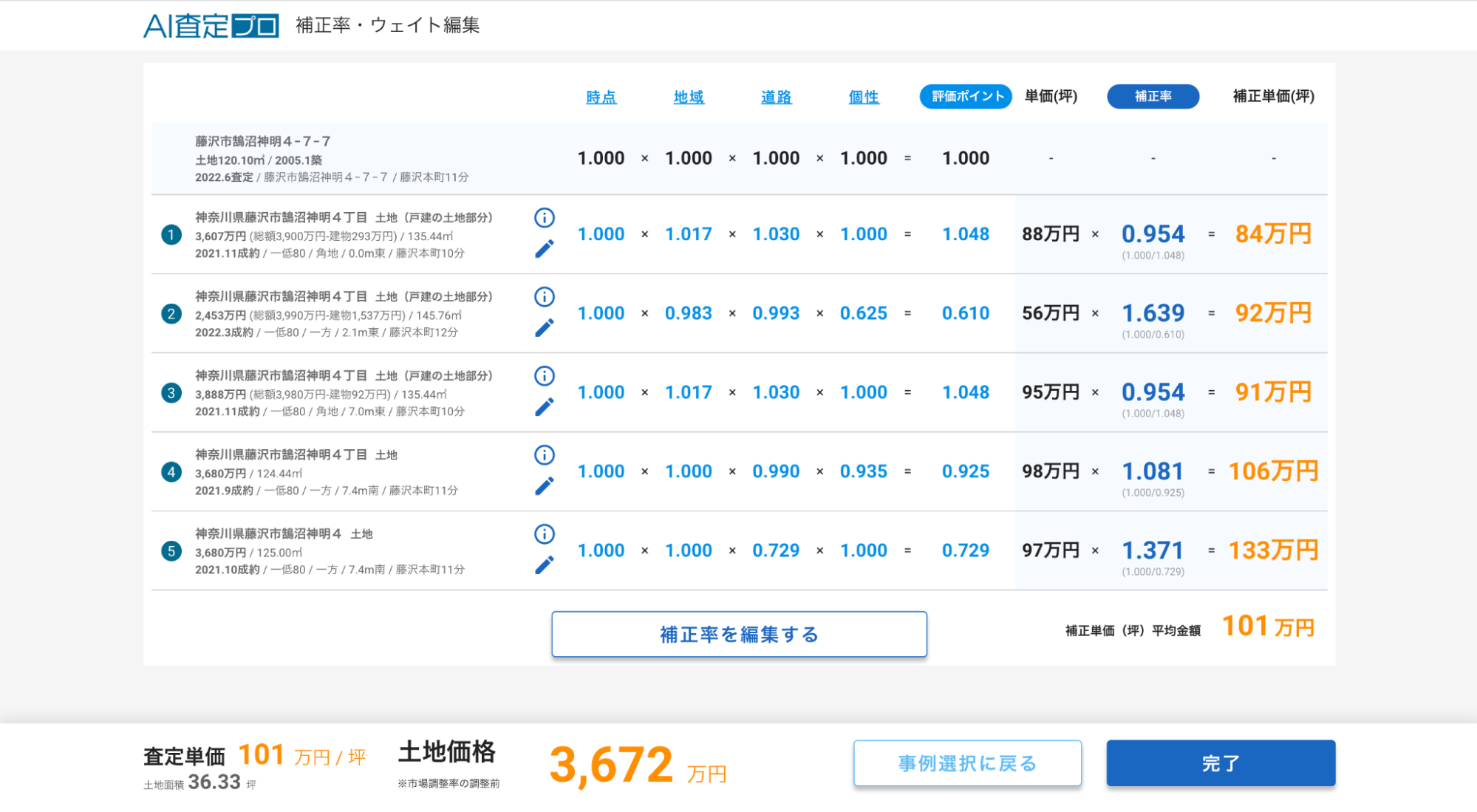 地域や時点など各種補正値はAIにより定期的に数値が更新されます。本格査定で最も頭を悩ませる「補正値の決定」をAIが行いますので、属人性が減り、査定業務に不慣れな若手でも質の高い査定が可能になります。