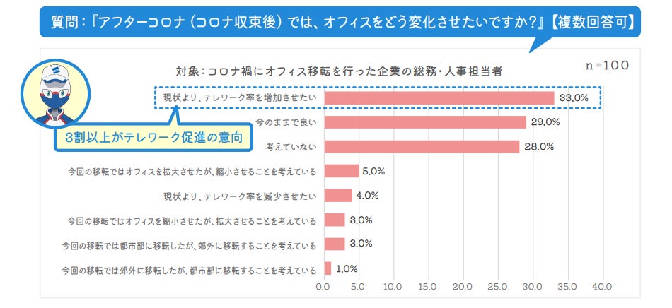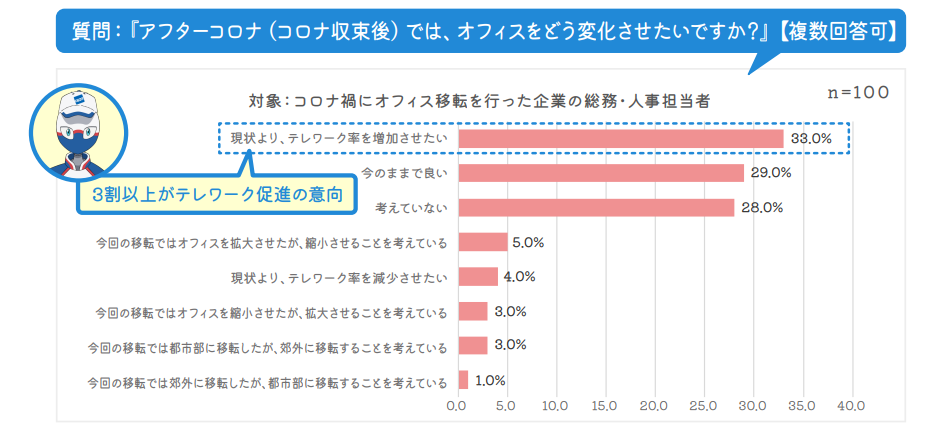 アフターコロナにおいて、オフィスをどう変化させ たいかを聞いたところ 、「 現状より、テレワーク率を増加させたい」が1位で33.0%でした 。