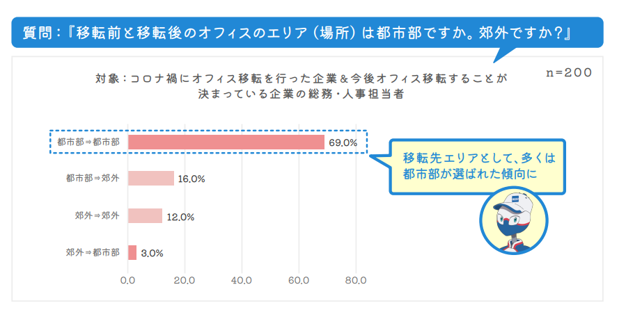 移転先のエリア(都市部または郊外) について質問したところ 、都市部から都市部に移転したという企業が7割 近くを占め 、最多でした。コロナ禍による働き方の多様化で 、郊外に移転する企業も多く存在するかと思われましたが 、やはり都心人気は変わらない結果でした 。