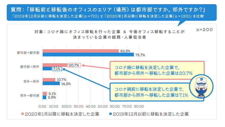 2019年12月以前のコロナ禍前に移転を決定した企業で、都市部から郊外へ移転した企業は7.1%であったのに対して、2020年1月以降のコロナ禍に移転を決定した企業で、都市部から郊外へ移転した企業は20.7% という結果でした 。この結果から、コロナ禍の間に移転することを決定した企業の方が、移転先に都市部ではなく郊外を選ぶ割合が約13ポイント高いことがわかりました。全体の割合としては都市部への移転が多いですが、移転の決 定時期で分けて比 較すると、コロナ禍に移転を決定した企業の方が比較的郊外への移転を望んだという結果で、テレワークの普及や感染対策の面を考慮した企業も一部存在したと考えられます。