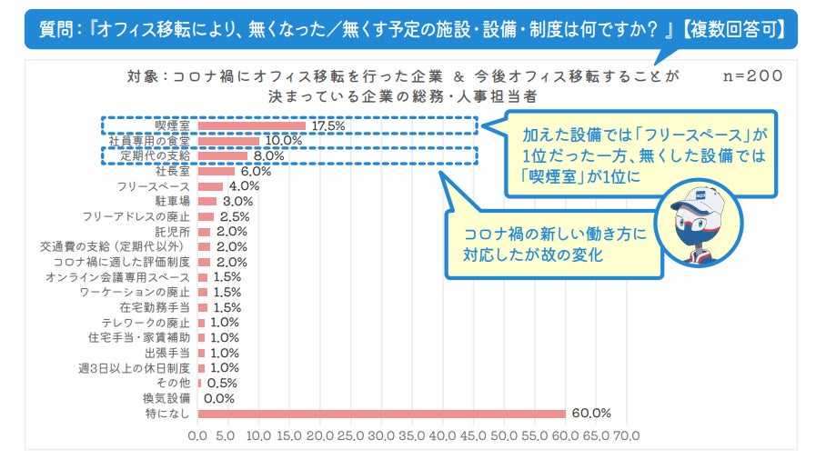 一方、無くした・無くす予定の“施設・設備・制度”の第1位は「喫煙室」(17.5%)であった。