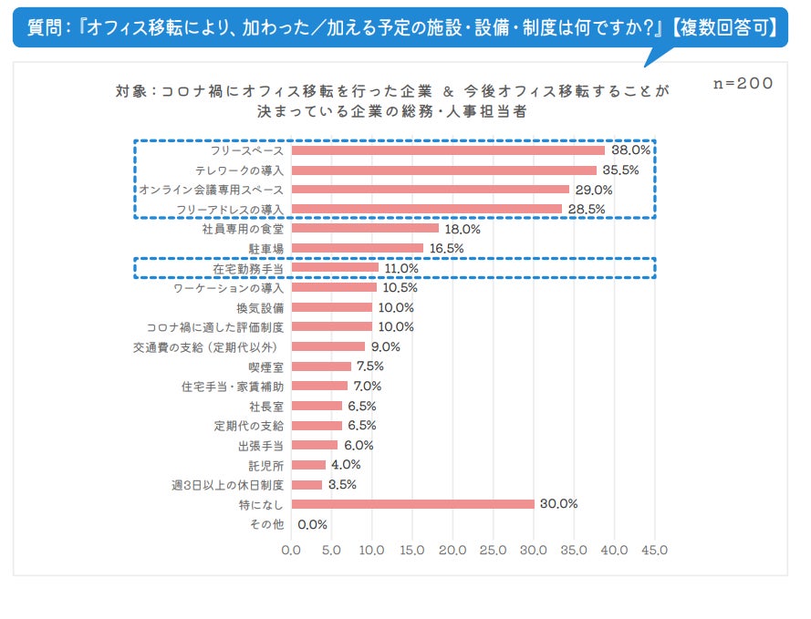 今回の移転で、新設した・する予定 の “ 施設・設備・制度 ” は 何かを聞いたところ、「 フリースペース 」 ( 38 .0 %) が第1位となりました 。その他にも、「テレワークの導入 」、「オンライン会議専用スペース 」、 「フリーアドレスの導入、「在宅勤務手当」というコロナ禍ならではの回答が上位にランクインし、特に設備面において、 新しい働き方に合ったオフィスへ 変化していることがうかがえました。