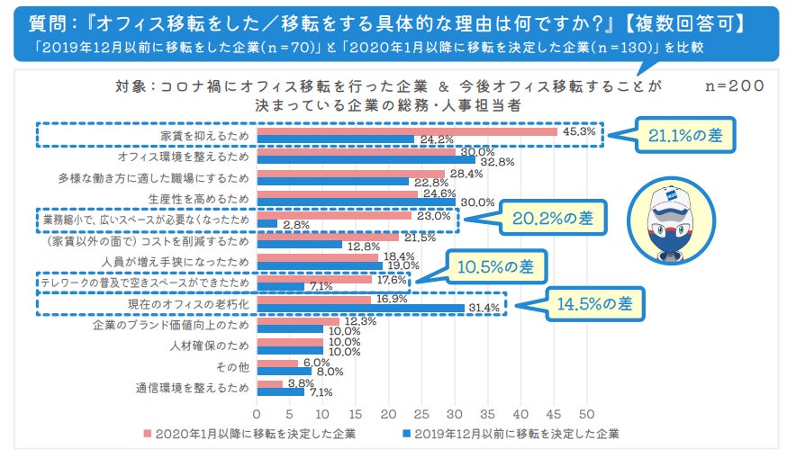 コロナ禍のオフィス移転は「面積」、「エリア」、「賃料」の3点において企業や社員からの満足度が高いことが判明