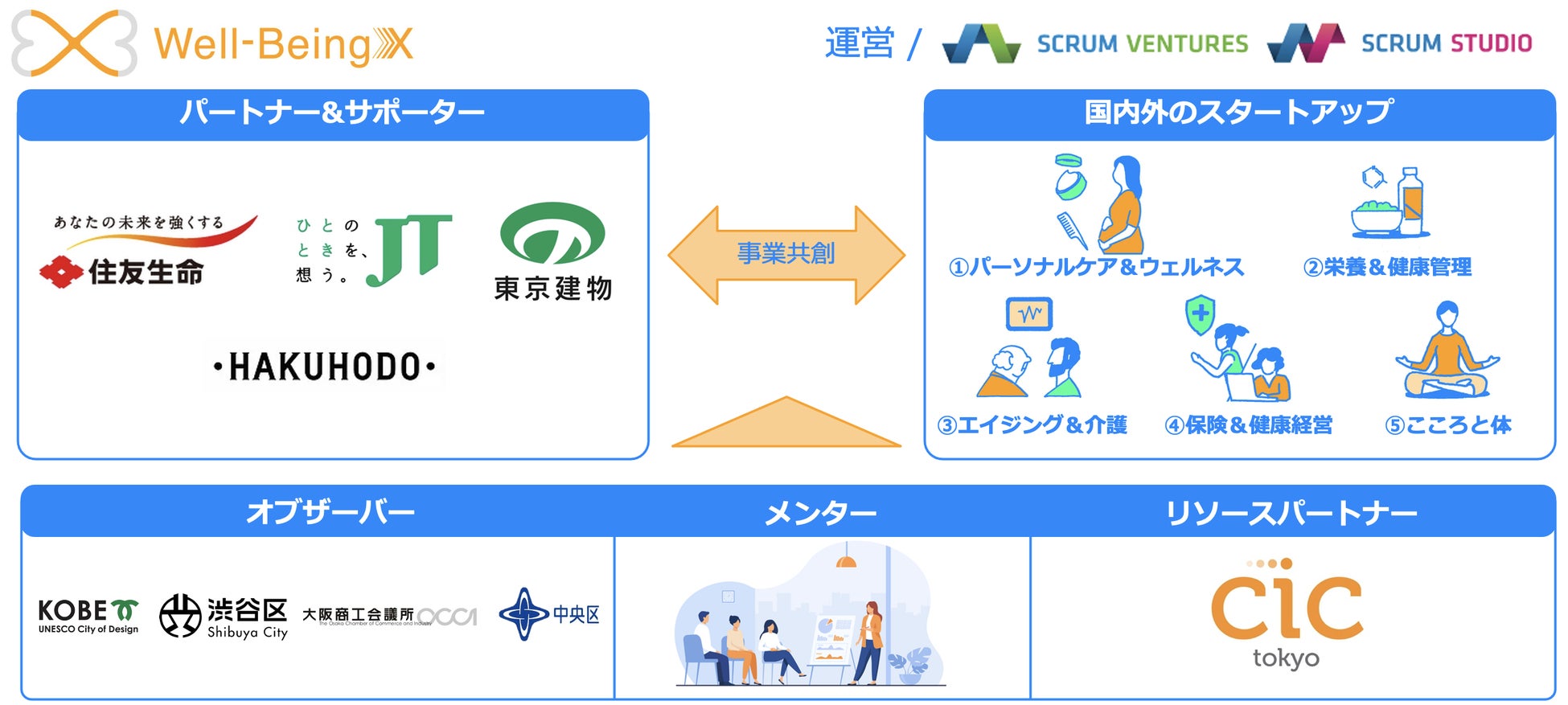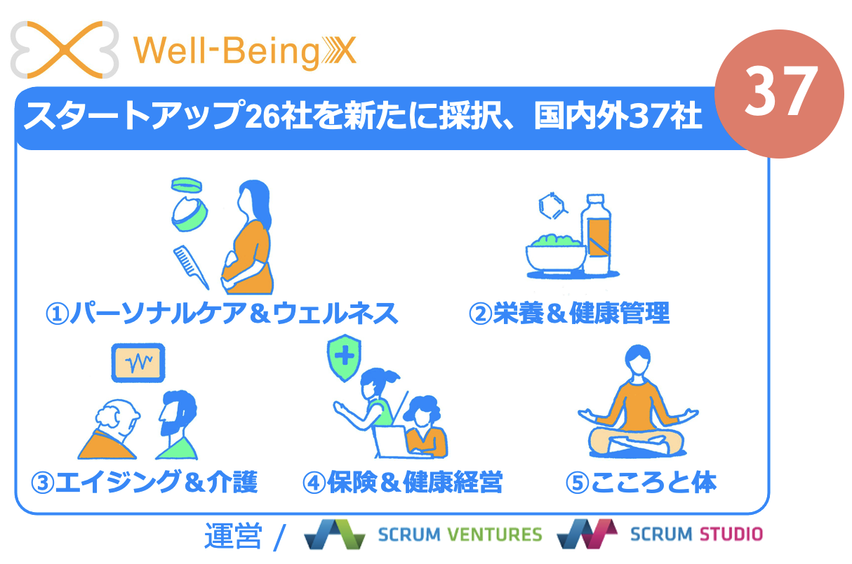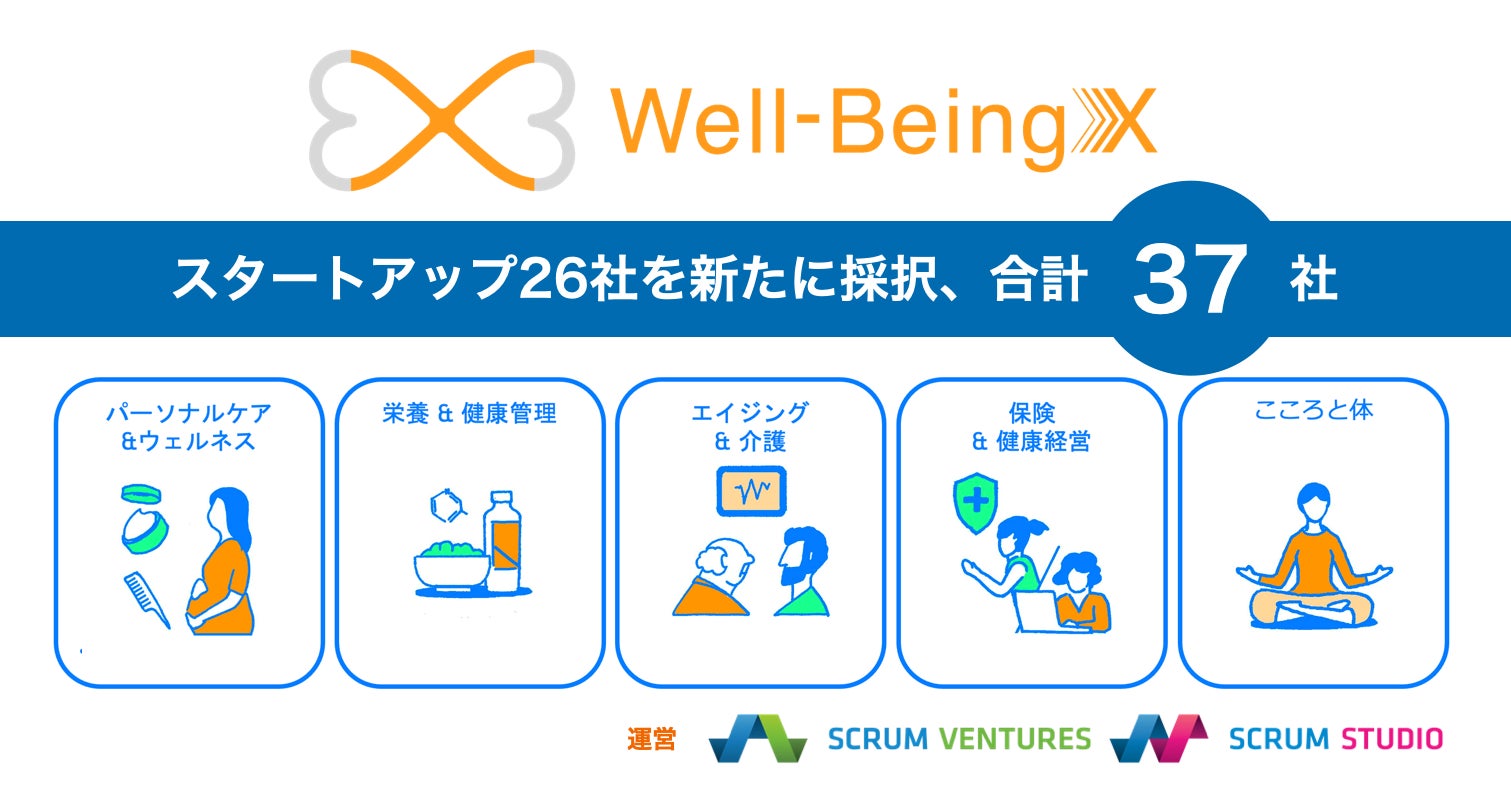 スクラムスタジオ株式会社(本社:東京都渋谷区、代表取締役社長:髙橋正巳)が主催する『Well-BeingX』ではこの度、事業開発プログラムにご参加いただくスタートアップとして、5月に早期採択を行った11社に加えて、新たに26社のスタートアップを採択したことを発表いたします。