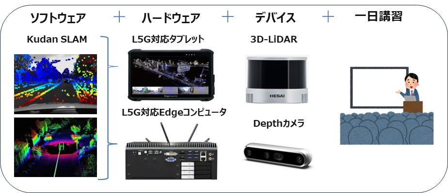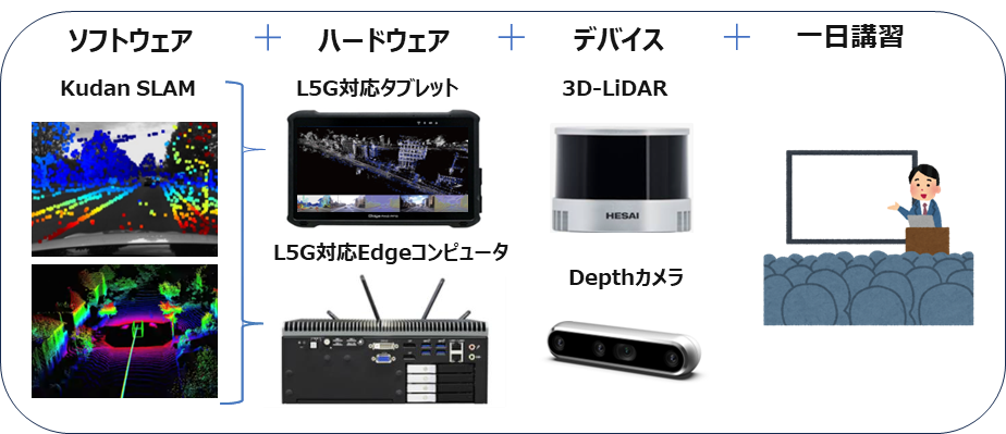 オールインワンパッケージ:KudanのSLAMベース位置測定ソフトウェアと、HPCシステムズのデータ取得用コンピュータ、管理用タブレット端末および、LiDARセンサー、カメラを1つのパッケージとして提供。さらに、使い方を学べる講習も含め、導入から運用までをトータルにサポート。