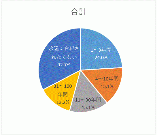 1.全体の回答では、「永遠に合祀されたくない」が32.7%とトップで「1~3年間」24.0%、「4~10年間」「11~30年間」が同率の15.1%と続く。「31~100年間」は最も少ない13.2%となった。“合祀される”という選択肢であれば、その期限については偏らない回答となり、全体の7割弱の方々が合祀される事に肯定的である結果となった。