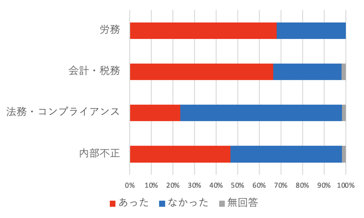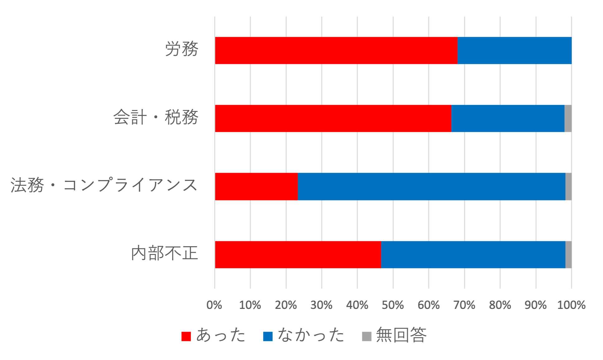 - 分野別では「労務」「会計・税務」が約70%、次いで「内部不正」が約50%