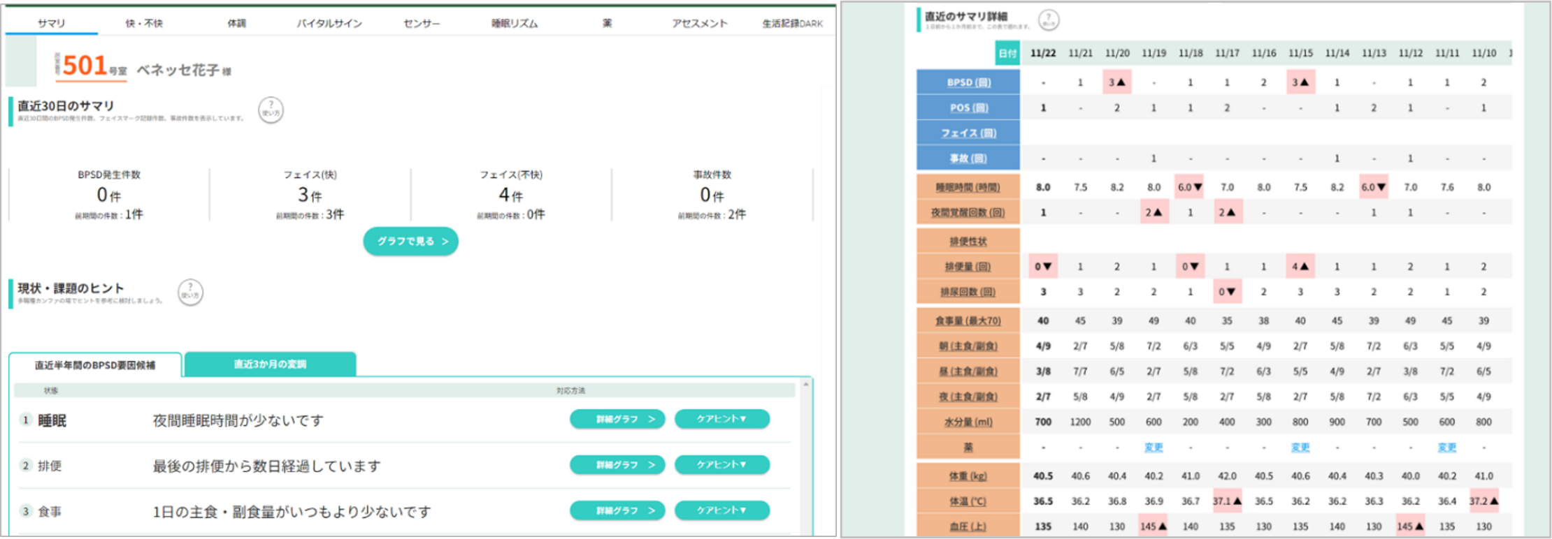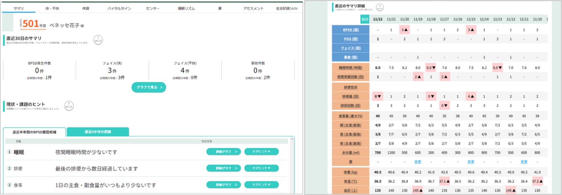▲「マジ神AI」画面イメージ ご入居者様の現在の状態と、その状態を解決するための具体的なケアヒントを表示