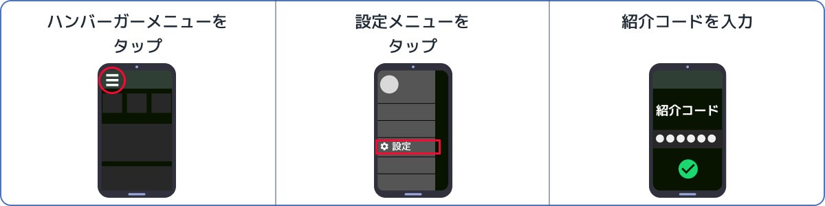 STEP2:紹介コードを登録します。左上の「≡(メニュー)」>「設定」より「紹介コード入力」を選択。紹介コードを入力し、画面右上の「保存する」を押すと完了です。