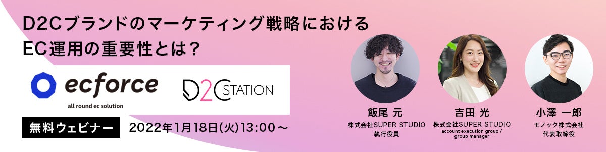 【1/18(火) 13:00】ecforceを運営するSUPER STUDIOとD2C STATIONを運営するモノック共催ウェビナー「D2Cブランドのマーケティング戦略におけるEC運用の重要性とは」
