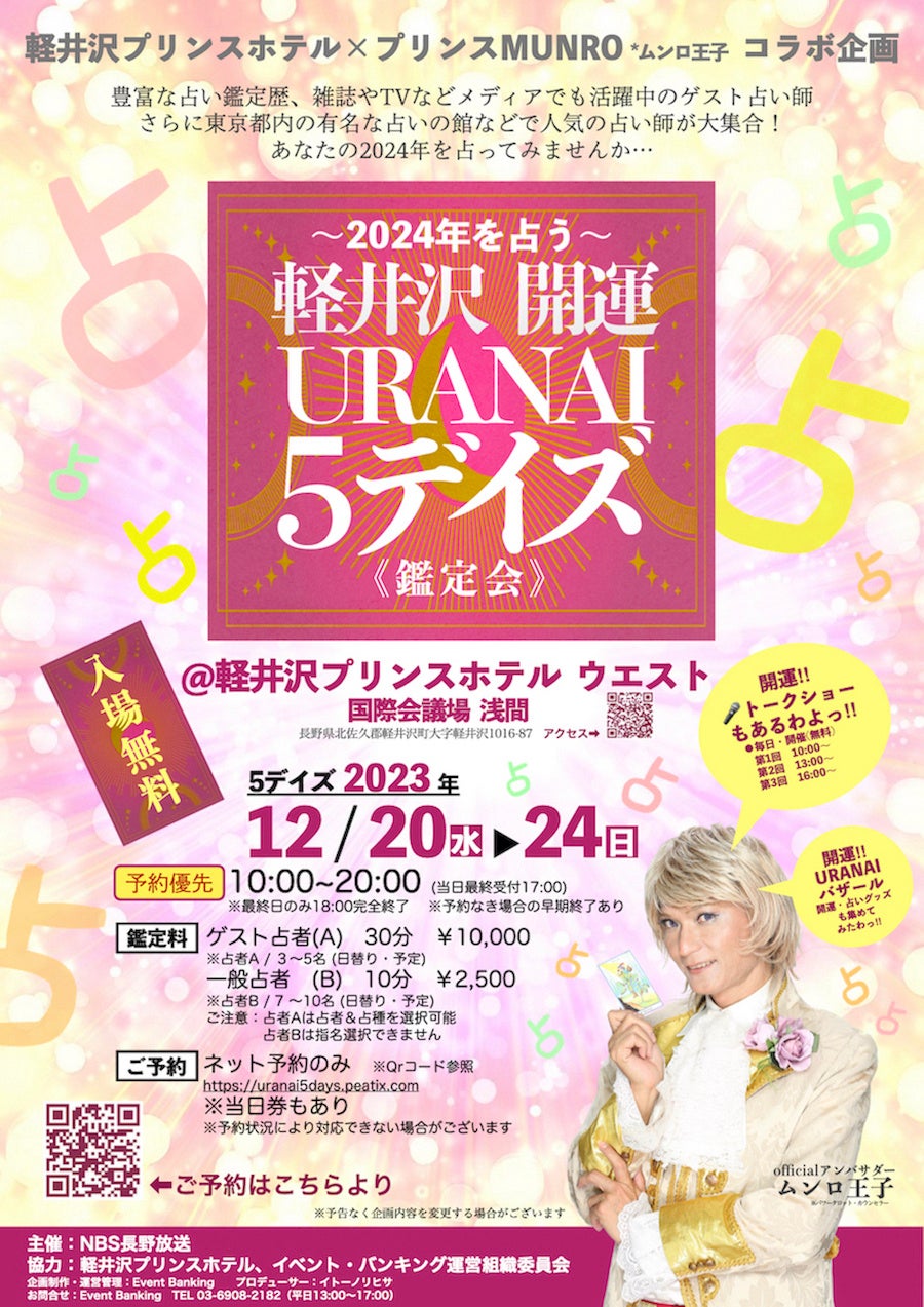 ムンロ王子がメインキャラクターの初の占い イベントが長野・軽井沢で開催されることにとても慶んでおります。今回は選りすぐりの精鋭部隊の占い師を投入するわよ。コロナが明けて時代が大きく変化する今だからこそ、《占い》を上手く活用して「風向きを読み」つつ、皆さんの人生を切り開いて欲しいわ。為せば成る、為さねば成らぬ何事も。