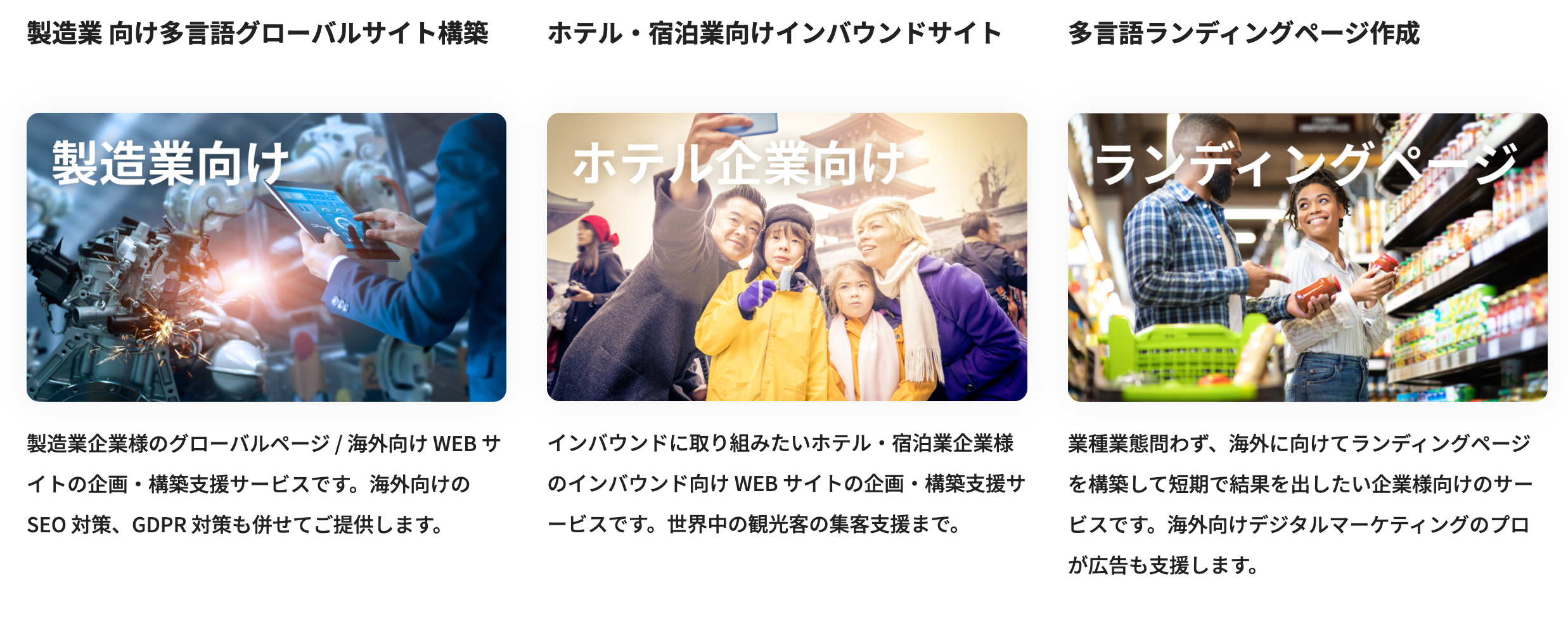 従前よりご提供していた、海外向けの多言語 WEB サイト制作を強化し、「訪日インバウンドのうち、ホテル企業」「製造業の海外進出」「多言語でのランディングページ」の3つを重点領域として指定。