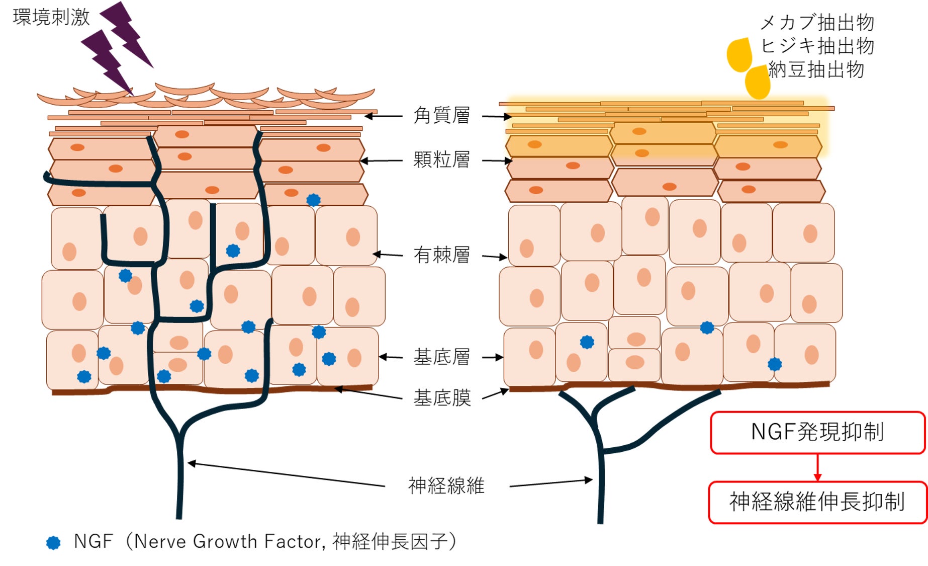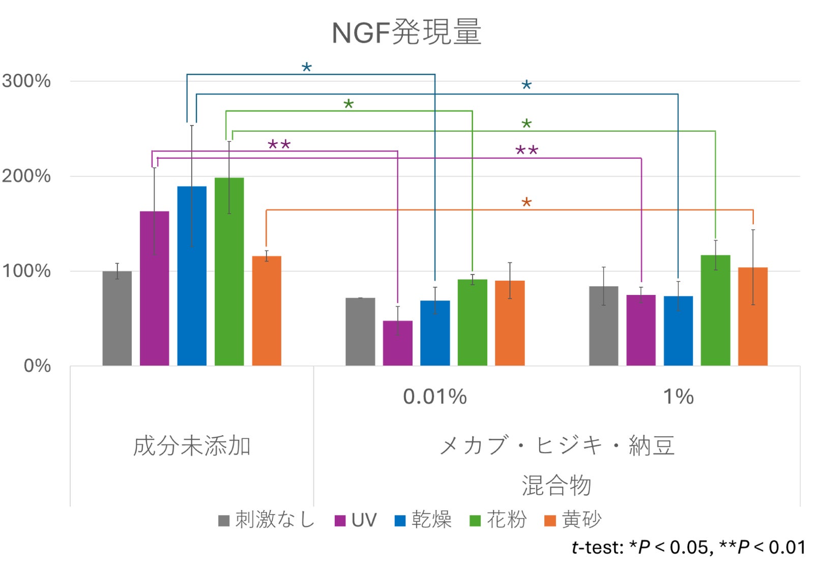 NGF発現抑制成分のスクリーニングをヒト正常表皮角化細胞への成分添加試験にて行いました。またNGF発現を誘導する環境刺激として①紫外線照射②乾燥③花粉添加、④黄砂添加を行い、いずれの刺激に対してもNGF発現抑制効果を示す成分としてメカブ抽出物・ヒジキ抽出物・納豆抽出物の混合物を見出しました。
