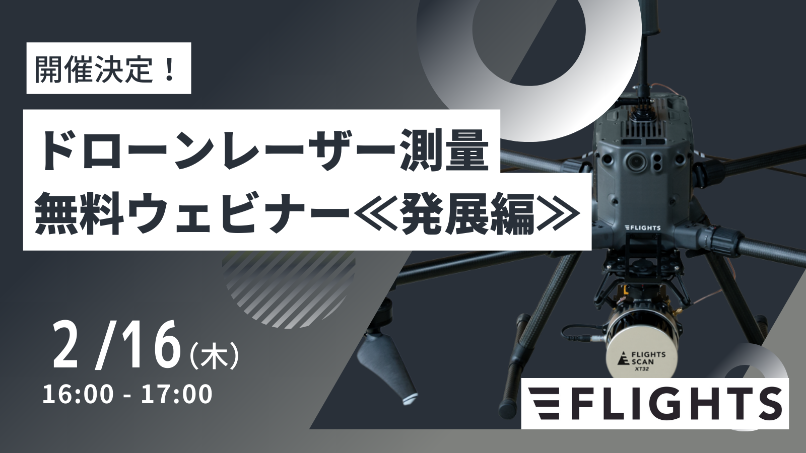 株式会社FLIGHTS(本社:東京都渋谷区、代表取締役:峠下周平 以下:FLIGHTS)は、2023年2月16日(木)16:00より、『ドローンレーザー測量 無料ウェビナー≪発展編≫』を開催いたします。本ウェビナーでは、前回開催の≪基礎編≫ウェビナーの発展編として、UAV LiDAR(レーザー)選びのポイントや、昨年8月に発売された自社製品である『測量のプロフェッショナルのための"空測用"LiDAR「FLIGHTS SCAN」』について詳しくお伝えしていきます。従来の高価格帯LiDARに比肩する性能を持ちながらもコストパフォーマンスに優れたドローン搭載型LiDARを用いて、測量業務の生産性向上を図りたい、業務の幅を広げたいという皆様は、是非この機会にご参加ください。