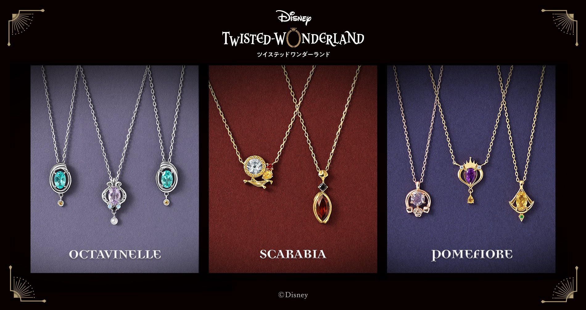 『ディズニー ツイステッドワンダーランド』コレクション第3弾☆「オクタヴィネル寮」「スカラビア寮」「ポムフィオーレ寮」の寮生たちをイメージしたネックレスが登場!