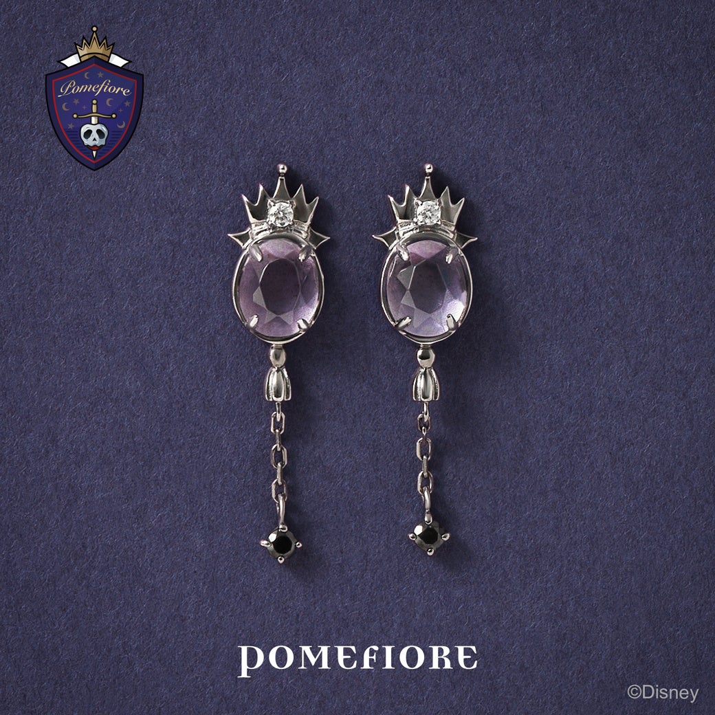 「エペル・フェルミエ」のアイコンに描かれている毒リンゴとリンゴをイメージし、繊細に表現しました。メインストーンにピンクアメジストを使用し、「エペル」の髪色をイメージしています。コイン風の丸いフォルムのため洋服に合わせやすく、普段使いにもおすすめです。