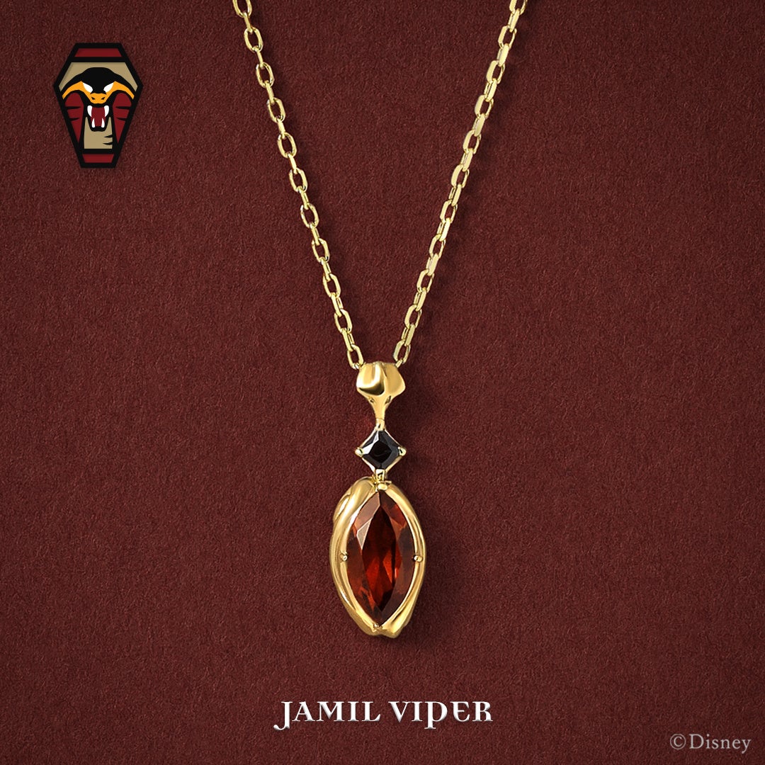 「ジャミル・バイパー」のアイコンに描かれているコブラをイメージし、バチカン部分に表現しました。メインストーンにガーネットを使用し、側面に煙風のデザインを取り入れています。高級感のある照り返しの石枠も使用する事で上品で落ち着いたデザインに仕上がりました。