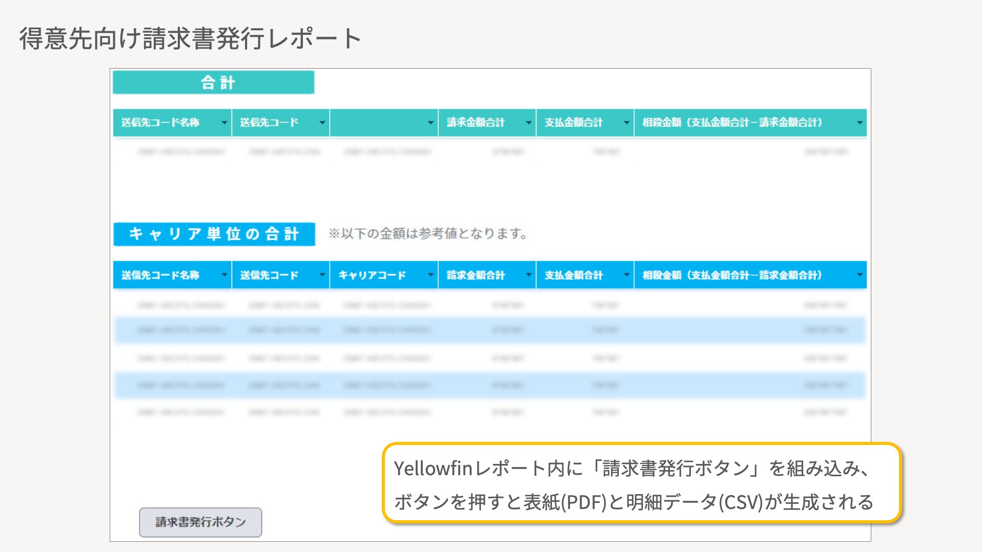 第三の効果は、得意先への請求書自動生成化が実現したこと。得意先への請求書をYellowfinレポートでフォーマット化したことにより自動生成化を実現させました。その際に事務担当者の作業プロセスを属人化させないような単純明快な仕組みにし、業務フローもシンプルで少ない手数となるような工夫もしました。その結果、各事務担当者の業務工数が90%近く削減できました。具体的には、毎月10営業日ほど費やしていた作業日数を2営業日程度まで大幅短縮することができ、得意先への請求書送付までの時間も短縮、事務担当者の負担軽減に大きく貢献できました。さらには本業務の標準化ができたため、事務担当者のジョブローテーションも行うことができました。