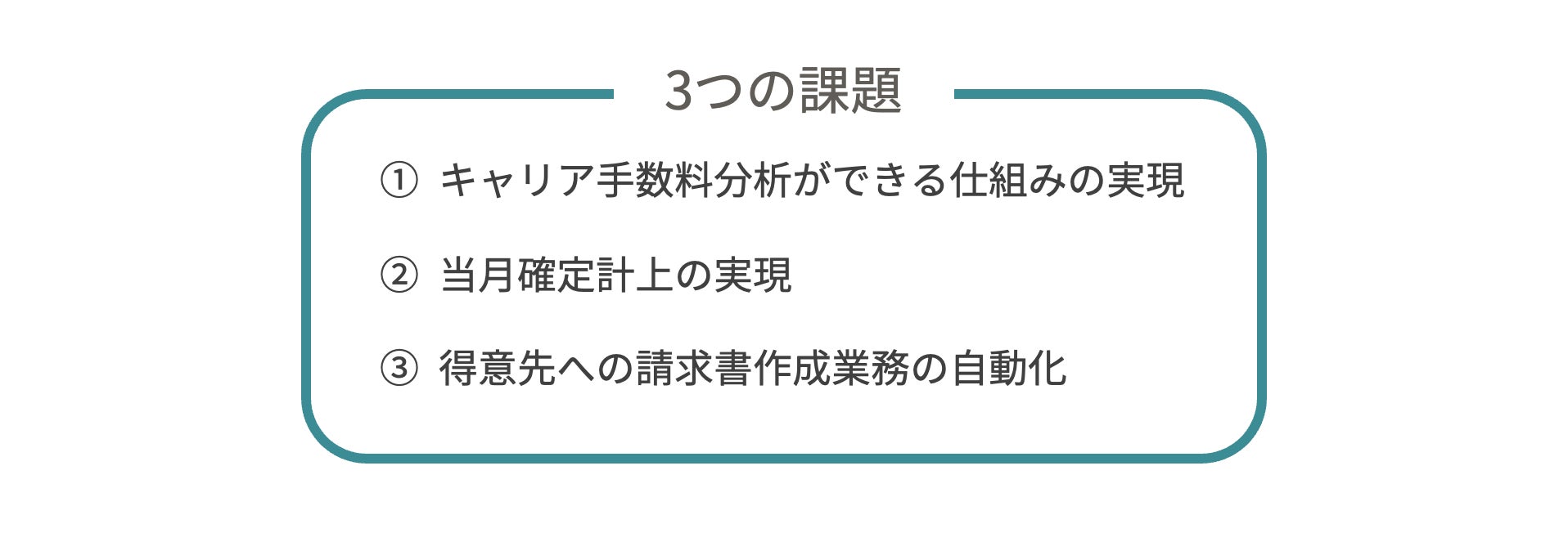 複雑化する携帯電話販売事業において、TDモバイルには頭を悩ませる3つの課題がありました。第一の課題は、複雑化しているキャリア手数料を素早く、正確に分析できる仕組みの導入。第二の課題は、計上精度の向上です。毎月の月次決算締め日までに確定計上することができていませんでした。第三の課題は、各事務担当者が手作業で実施している得意先への請求書作成業務を自動化することでした。
