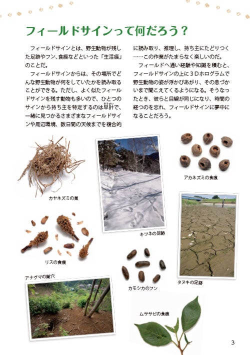 ・フィールドサインの写真に野生動物イラストを重ねて表示することで、実際のフィールドでどのように行動したのかが紙面上でよみがえります。