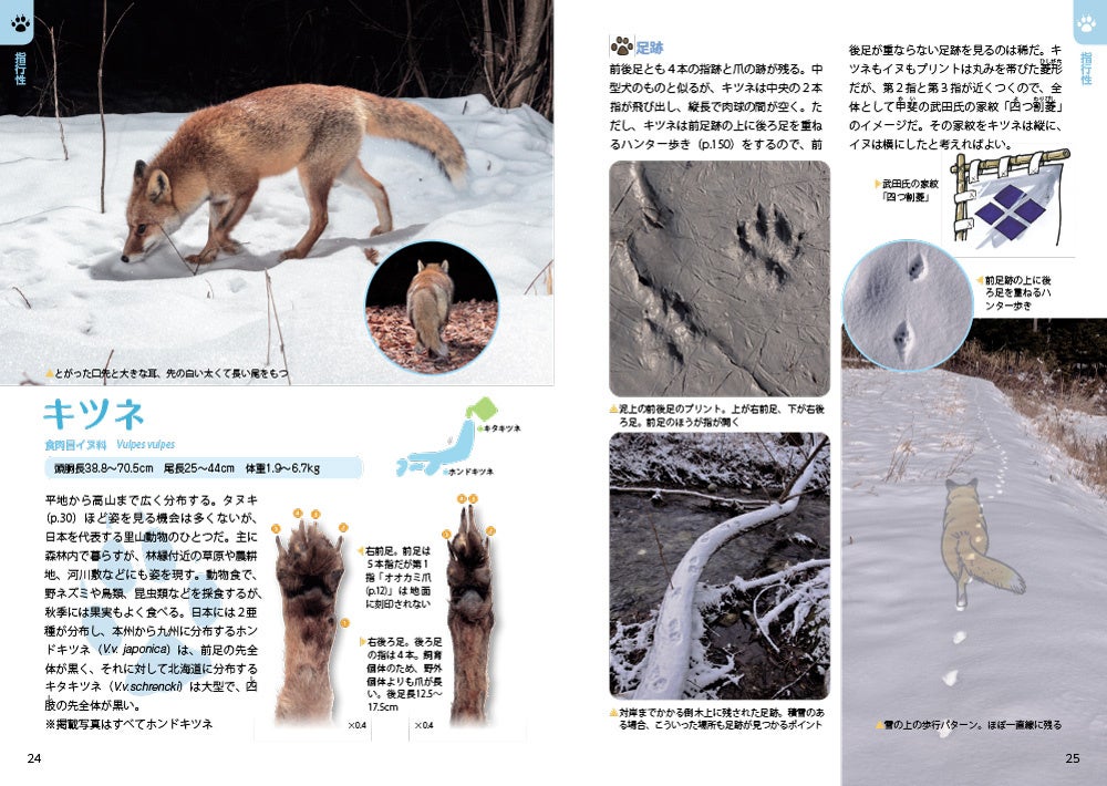 ・実際のフィールドに残された足跡の写真を多数掲載しているので、哺乳類の識別に活用できます。