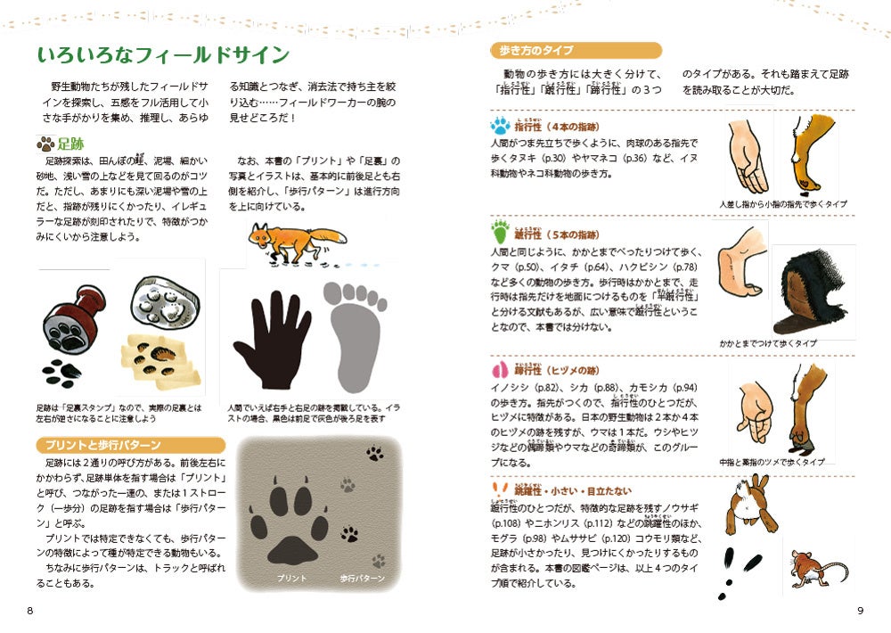 ・各種について、足跡や歩行パターン、食痕、フン、巣、けもの道など、さまざまなフィールドサインを掲載しています。