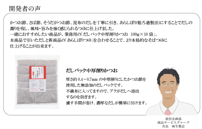 本商品で引いただしと新商品の「あらしぼりつゆ」を合わせることで、より本格的なそばつゆに