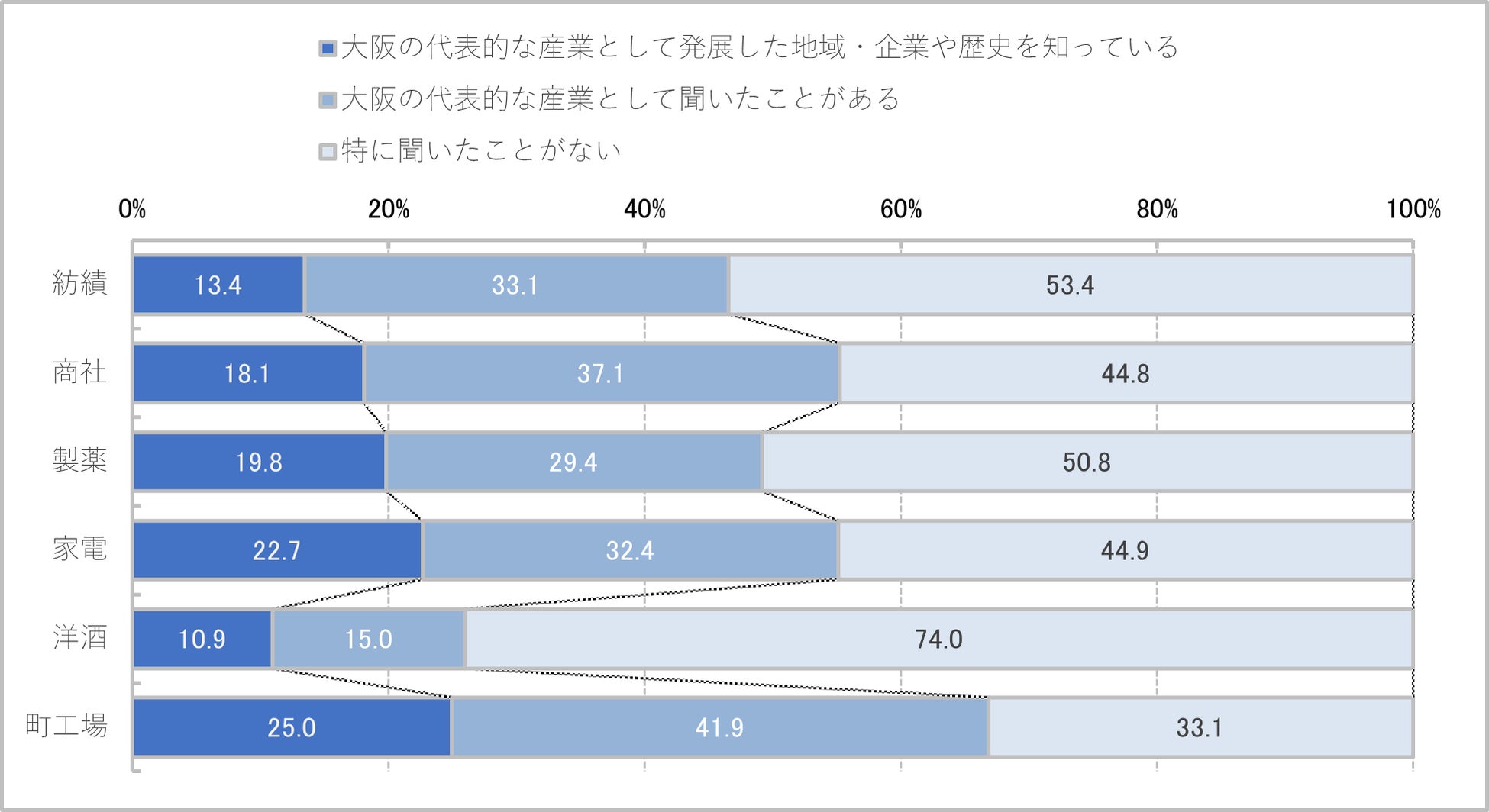 3.大阪の代表的な産業(紡績、商社、製薬、家電、洋酒、町工場)に対する認知の割合