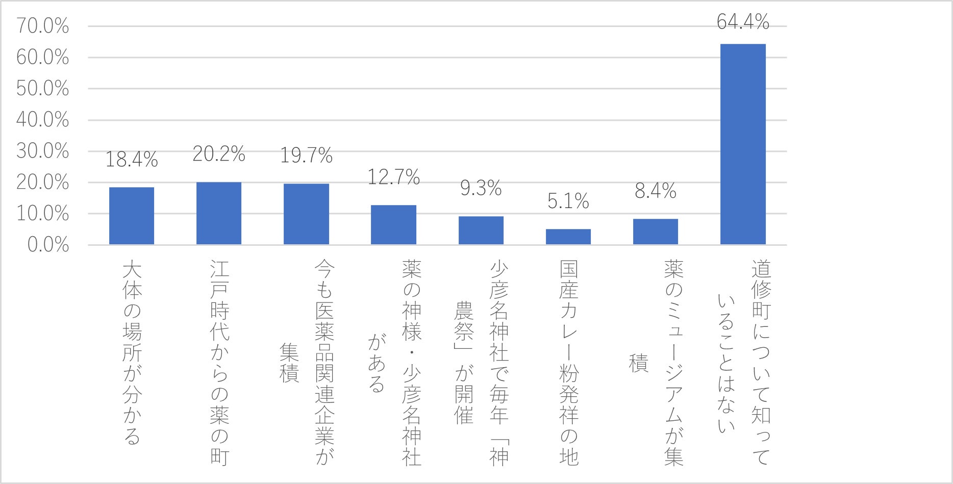 「道修町について知っていることはない」の回答が64.4%で、4年連続過去最高となりました。その他、道修町の立地がわかる割合(18.4%)、現役の「くすりの町」と認識する割合(19.7%)、「くすりの神様」を祀る少彦名神社を認識する割合(12.7%)も、2016年の調査開始以来最も低い水準となりました。一方、薬のミュージアムが集まる「道修町ミュージアムストリート」の存在を知っている割合については、8.4%と低値ではあるものの過去最高となりました。