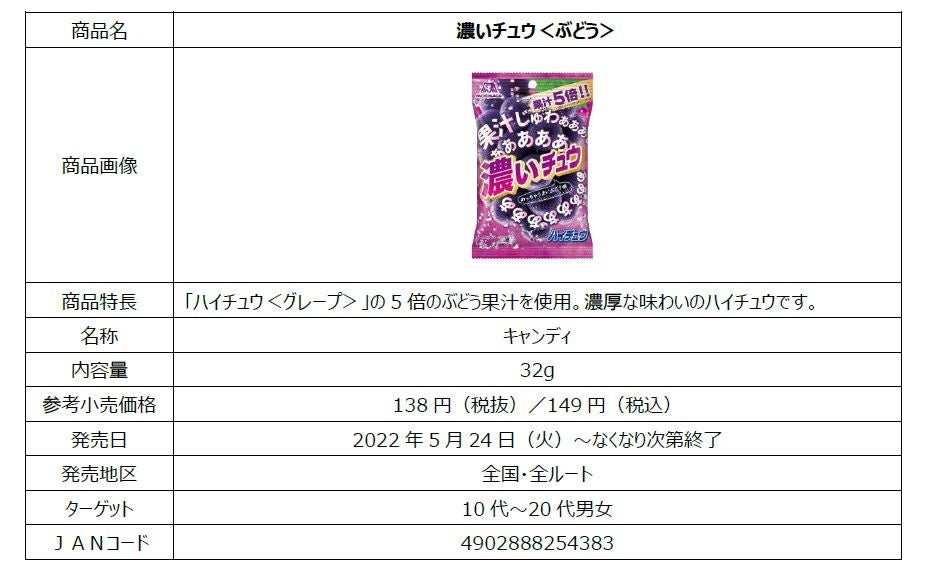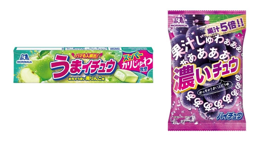 カリじゅわの食感を楽しめる「うまイチュウ<青りんご味>」 5月10日新発売 「ハイチュウ<グレープ>」の5倍のぶどう果汁使用!「濃いチュウ<ぶどう>」 5月24日 新発売