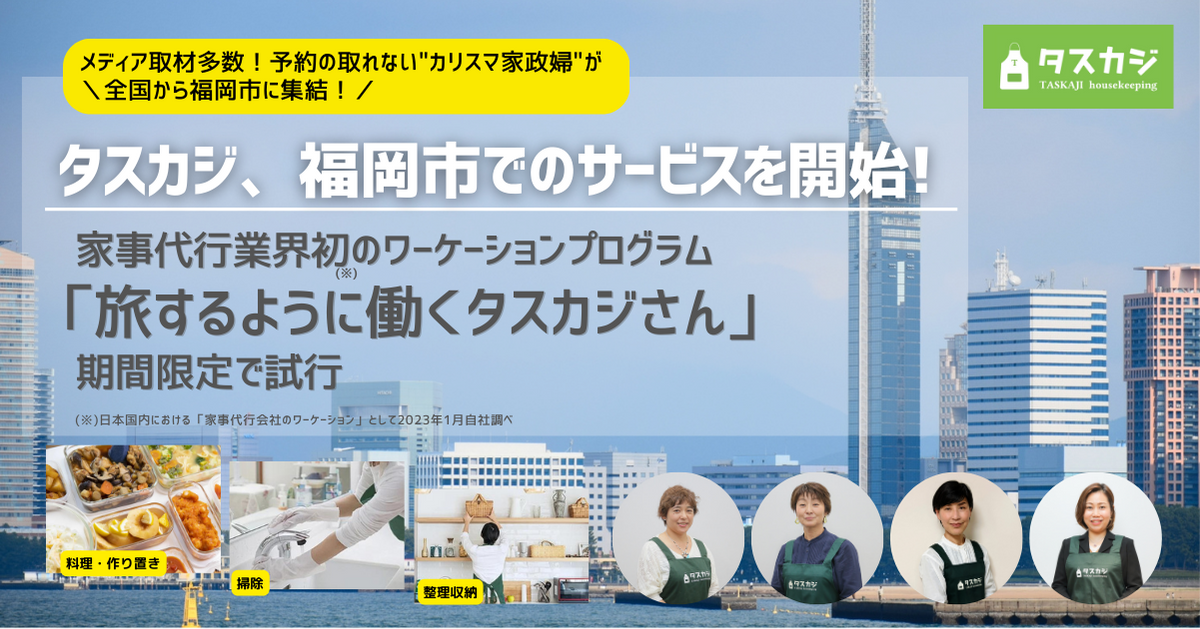 シェアリングエコノミーの家事代行マッチングプラットフォーム「タスカジ」を運営する、株式会社タスカジ(本社:東京都港区、代表取締役:和田幸子、以下タスカジ)は、本日2023年1月24日より福岡県福岡市とその近郊でサービスを開始いたしました。また、同時に約2600名のタスカジさん(=ハウスキーパー)を代表するカリスマ家政婦が期間限定で福岡市に集結し、家事代行業界初となるワーケーションプログラム「旅するように働くタスカジさん」を2月14日から期間限定で試行し、福岡エリアでの家事代行支援を実施します。本プロジェクトは福岡市が提供する福岡市内における新たな働き方と旅行スタイルを支援する無料WEBアプリ「ワフパス」内で提供されている特典などを活用して実施されます。