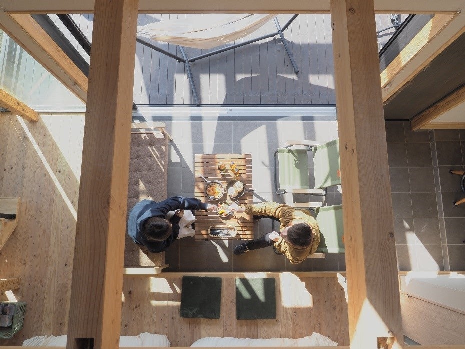 例えばチェックイン、チェックアウトはスマートキー方式を採り、あとは滞在中の楽しみを多彩なオプションをネット上で選択していくだけで、全く人を介在することなくスマホひとつでプランを組み立てることができます。その楽しみとしてはBBQ、カフェモーニングサービス、野菜の収穫体験、ジップラインなどのアクティビティ、サウナのある天然温泉「おふろcafé かりんの湯」などTHE FARMで実績のあるコンテンツ利用が可能。それぞれの旅のタイムライン、そのときの気分に合わせて、ご自分自身で自由にチョイスをしていただけます。
